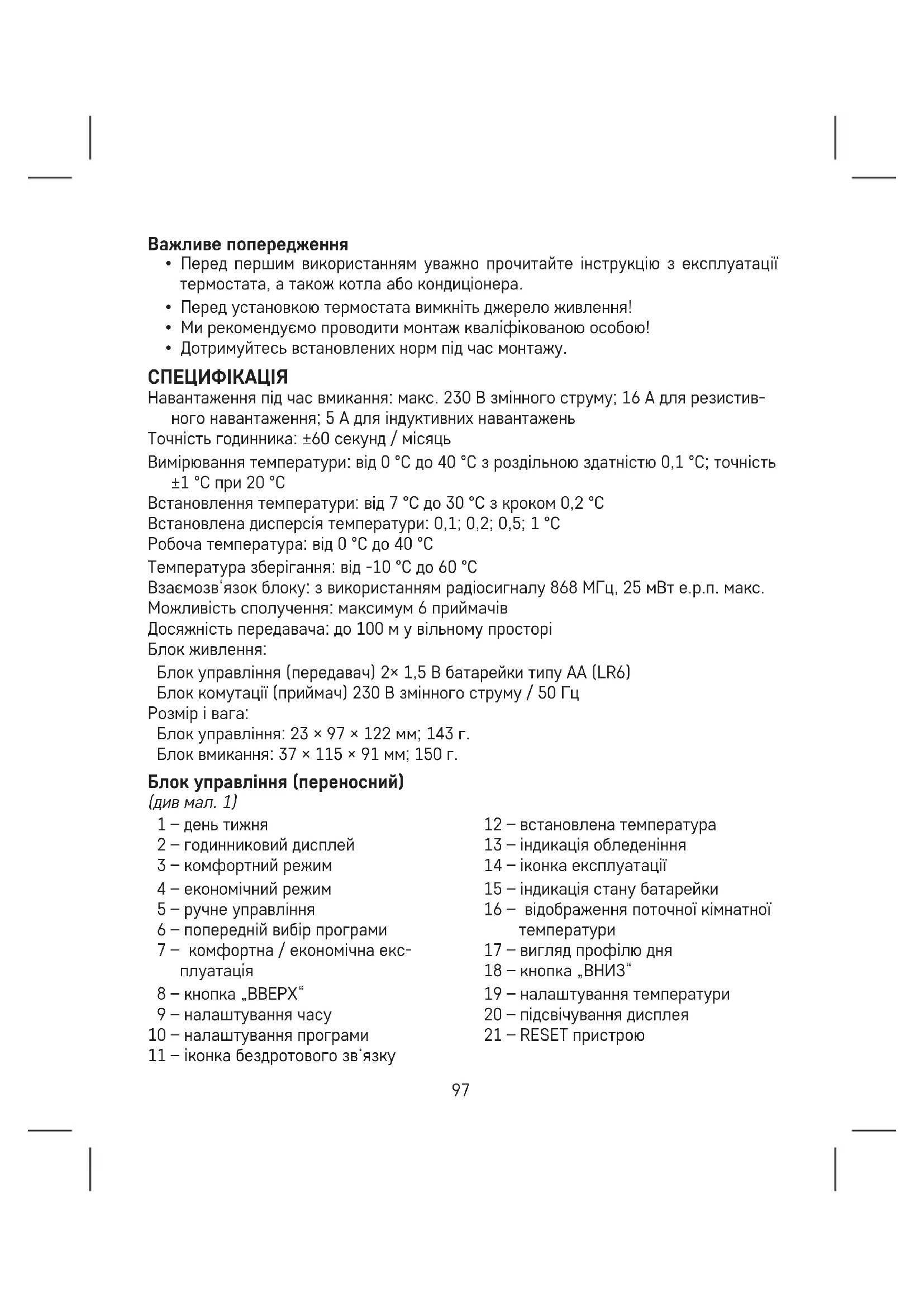- Дотримуйтесь встановлених норм під час монтажу. СПЕЦИФІКАЦІЯ Навантаження під час вмикання: макс. 230 В змінного струму; 16 А для резистив- ного навантаження; 5 А для індуктивних навантажень Точність годинника: ±60 секунд / місяць Вимірювання температури: від 0 °C до 40 °C з роздільною здатністю 0,1 °C; точність ±1 °C при 20 °C Встановлення температури: від 7 °C до 30 °C з кроком 0,2 °C Встановлена дисперсія температури: 0,1; 0,2; 0,5; 1 °C Робоча температура: від 0 °C до 40 °C Температура зберігання: від -10 °C до 60 °C Взаємозв‘язок блоку: з використанням радіосигналу 868 МГц, 25 мВт е.р.п. макс. Можливість сполучення: максимум 6 приймачів Досяжність передавача: до 100 м у вільному просторі Блок живлення: Блок управління (передавач) 2× 1,5 В батарейки типу AA (LR6) Блок комутації (приймач) 230 В змінного струму / 50 Гц Розмір і вага: Блок управління: 23 × 97 × 122 мм; 143 г. Блок вмикання: 37 × 115 × 91 мм; 150 г. Блок управління (переносний) (див мал. 1) 1 – день тижня 2 – годинниковий дисплей 3 – комфортний режим 4 – економічний режим 5 – ручне управління 6 – попередній вибір програми 7 – комфортна / економічна екс-