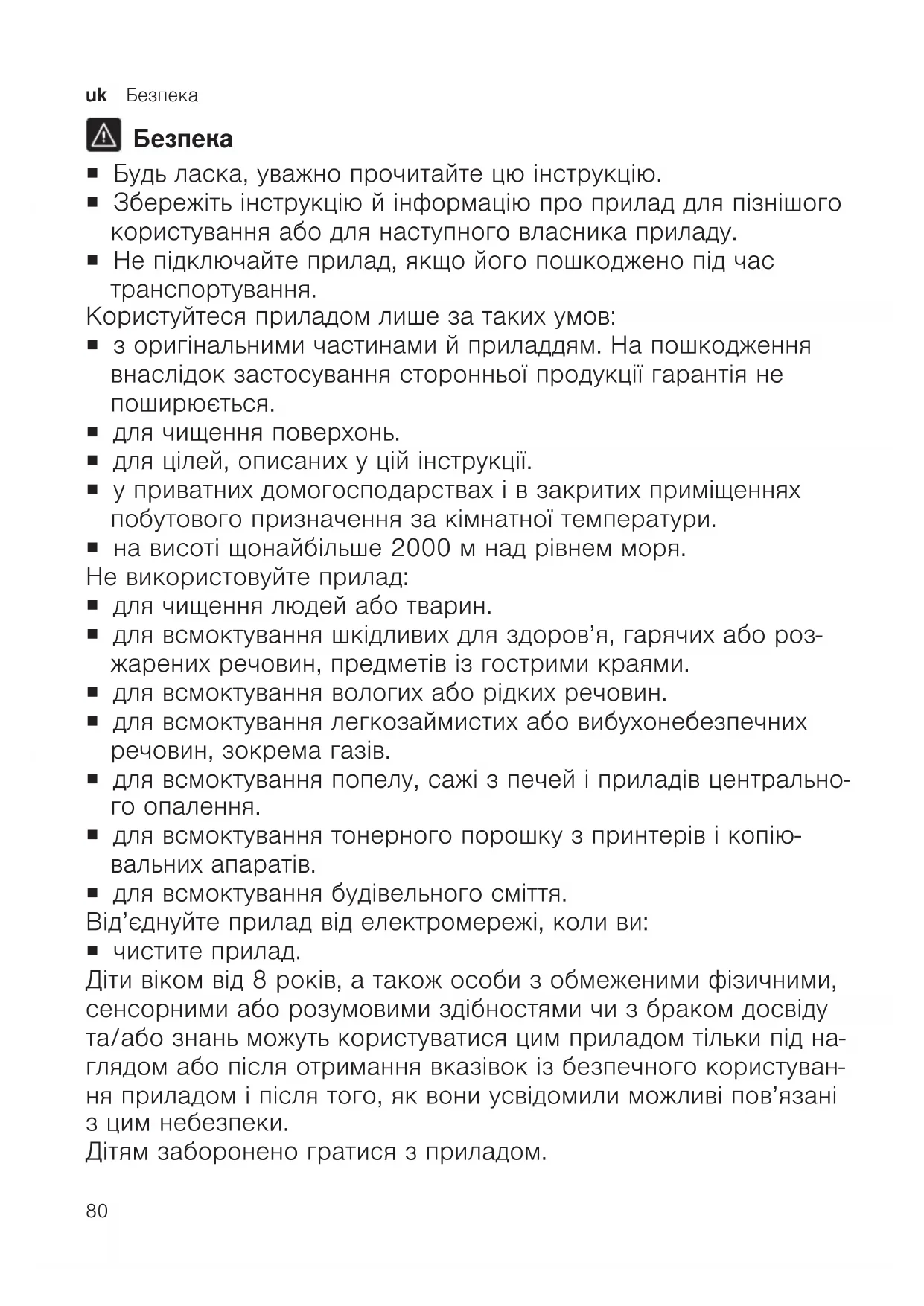 ¡ Будь ласка, уважно прочитайте цю інструкцію. ¡ Збережіть інструкцію й інформацію про прилад для пізнішого користування або для наступного власника приладу. ¡ Не підключайте прилад, якщо його пошкоджено під час транспортування. Користуйтеся приладом лише за таких умов: ¡ з оригінальними частинами й приладдям. На пошкодження внаслідок застосування сторонньої продукції гарантія не поширюється. ¡ для чищення поверхонь. ¡ для цілей, описаних у цій інструкції. ¡ у приватних домогосподарствах і в закритих приміщеннях побутового призначення за кімнатної температури. ¡ на висоті щонайбільше 2000м над рівнем моря. Не використовуйте прилад: ¡ для чищення людей або тварин. ¡ для всмоктування шкідливих для здоров’я, гарячих або роз- жарених речовин, предметів із гострими краями. ¡ для всмоктування вологих або рідких речовин. ¡ для всмоктування легкозаймистих або вибухонебезпечних речовин, зокрема газів. ¡ для всмоктування попелу, сажі з печей і приладів центрально- го опалення. ¡ для всмоктування тонерного порошку з принтерів і копію- вальних апаратів. ¡ для всмоктування будівельного сміття. Від’єднуйте прилад від електромережі, коли ви: ¡ чистите прилад. Діти віком від 8років, а також особи з обмеженими фізичними, сенсорними або розумовими здібностями чи з браком досвіду та/або знань можуть користуватися цим приладом тільки під на- глядом або після отримання вказівок із безпечного користуван- ня приладом і після того, як вони усвідомили можливі пов’язані з цим небезпеки. Дітям заборонено гратися з приладом.Безпека uk