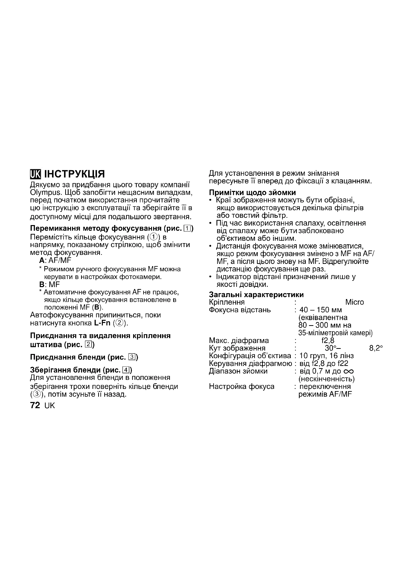 Дякуємо за придбання цього товару компанії Olympus. Щоб запобігти нещасним випадкам, перед початком використання прочитайте цю інструкцію з експлуатації та зберігайте її в доступному місці для подальшого звертання. Перемикання методу фокусування (рис.