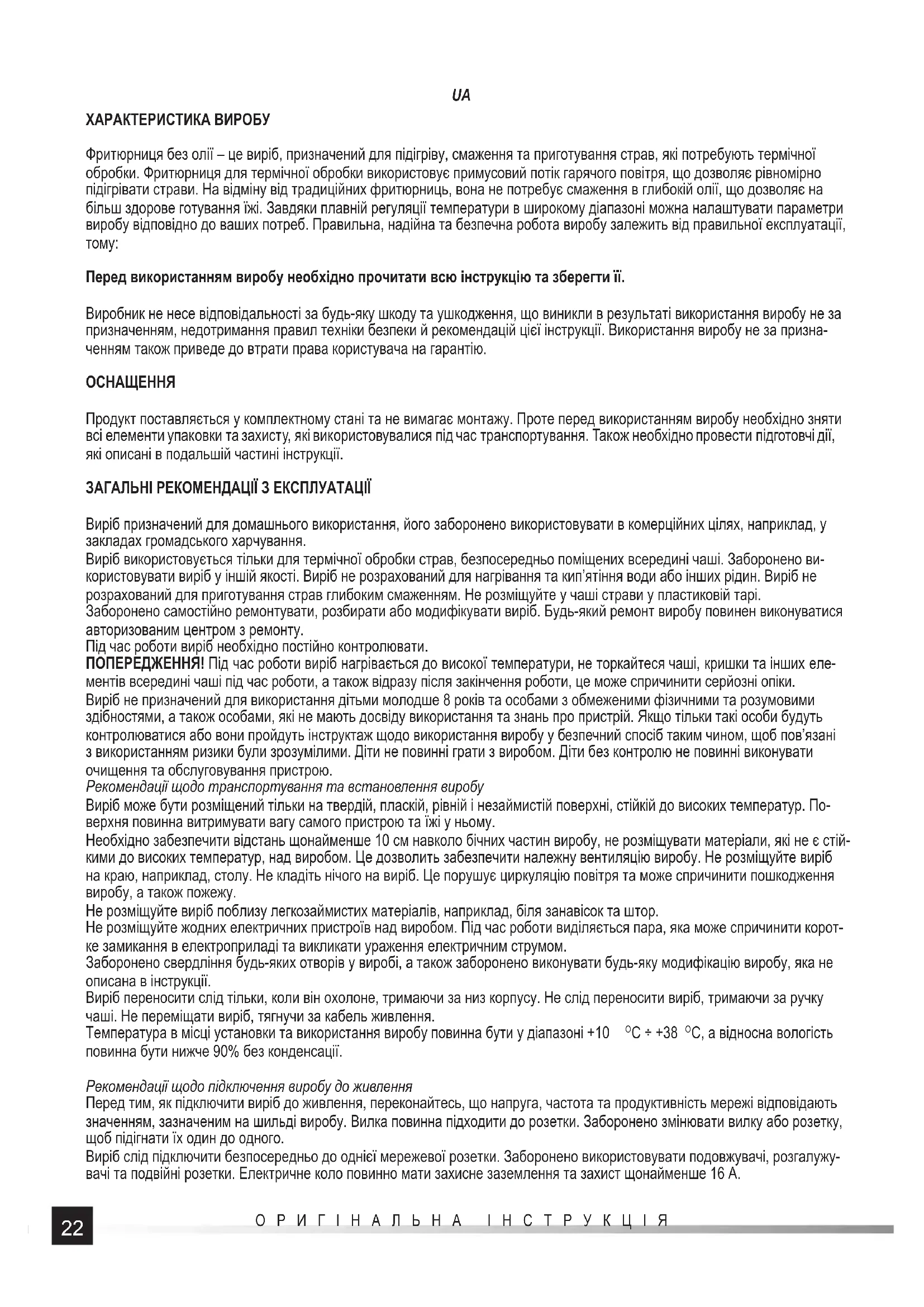 Увага! Під час програмування налаштувань виріб автоматично повертається в режим очікування приблизно через хвилину від останнього натискання кнопки. Після встановлення часу та температури слід протягом хвилини натиснути вмикач. Розпочнеться робота виробу. Це відо- бразиться блиманням символу вентилятора. Коли символ вентилятора горить червоним, це означає роботу грілки виробу. Коли символ вентилятора горить синім, це означає роботу вентилятора. Виріб можна будь-коли вимкнути, торкнувшись кнопки вмикача. Після вимкнення вентилятор може працювати деякий час, прискорюючи охолодження грілки. Не від’єднуйте виріб від живлення протягом цього часу. Після завершення охолодження грілки виріб автоматично перейде в режим очікування. Від’єднайте кабель живлення від розетки. Встановлення, запуск та обслуговування виробу Виріб слід розпакувати, повністю зняти всі елементи упаковки та захисні елементи, які використовувалися під час транспор- тування. Рекомендується зберегти упаковку, вона буде придатна при подальшому транспортуванні та зберіганні виробу. Вимити виріб згідно з вказівками у пункті «Технічний догляд за виробом». Розмістити виріб згідно з рекомендаціями інструкції. Вставте чашу разом із встановленою порожньою ємністю в корпус виробу. Під час розміщення чаші кришка кнопки засувки повинна бути над кнопкою. Підключіть виріб до живлення. Встановіть максимальну температуру. Встановіть час на 3 хвилини, щоб попередньо нагріти чашу та ємність. Засвітиться індикатор, що вказує на початок роботи. Після закінчення встановленого часу прозвучить сигнал, а індикатор погасне. Будьте обережні, візьміться за ручку чаші та витягніть її з корпусу виробу. Чаша та ємність будуть гарячими, тому не торкайтесь їх. Покладіть їжу, підготовлену для термічної обробки, всередину ємності. Якщо виріб оснащено додатковими приналежностями, такими як каструля, сковорода для піци або перегородка, помістіть їх всередину вкладиша. Для правильної роботи фритюрниці завжди необхідна чаша з встановленим вкладишем. Увага! Рівень харчових продуктів всередині ємності не повинен перевищувати позначки максимального вмісту ємності. Вставте чашу з ємністю та їжею в корпус виробу. Встановіть час згідно з рецептом приготування їжі. Періодично перевіряйте стан їжі, яку готуєте, виймаючи чашу на короткий час. При необхідності змініть налаштування часу та / або температури. Увага! Будьте обережні, виймаючи чашу. Під час приготування їжі чаша нагрівається до високої температури. Брати тільки25 ОРИГІНАЛЬНА ІНСТРУКЦІЯ