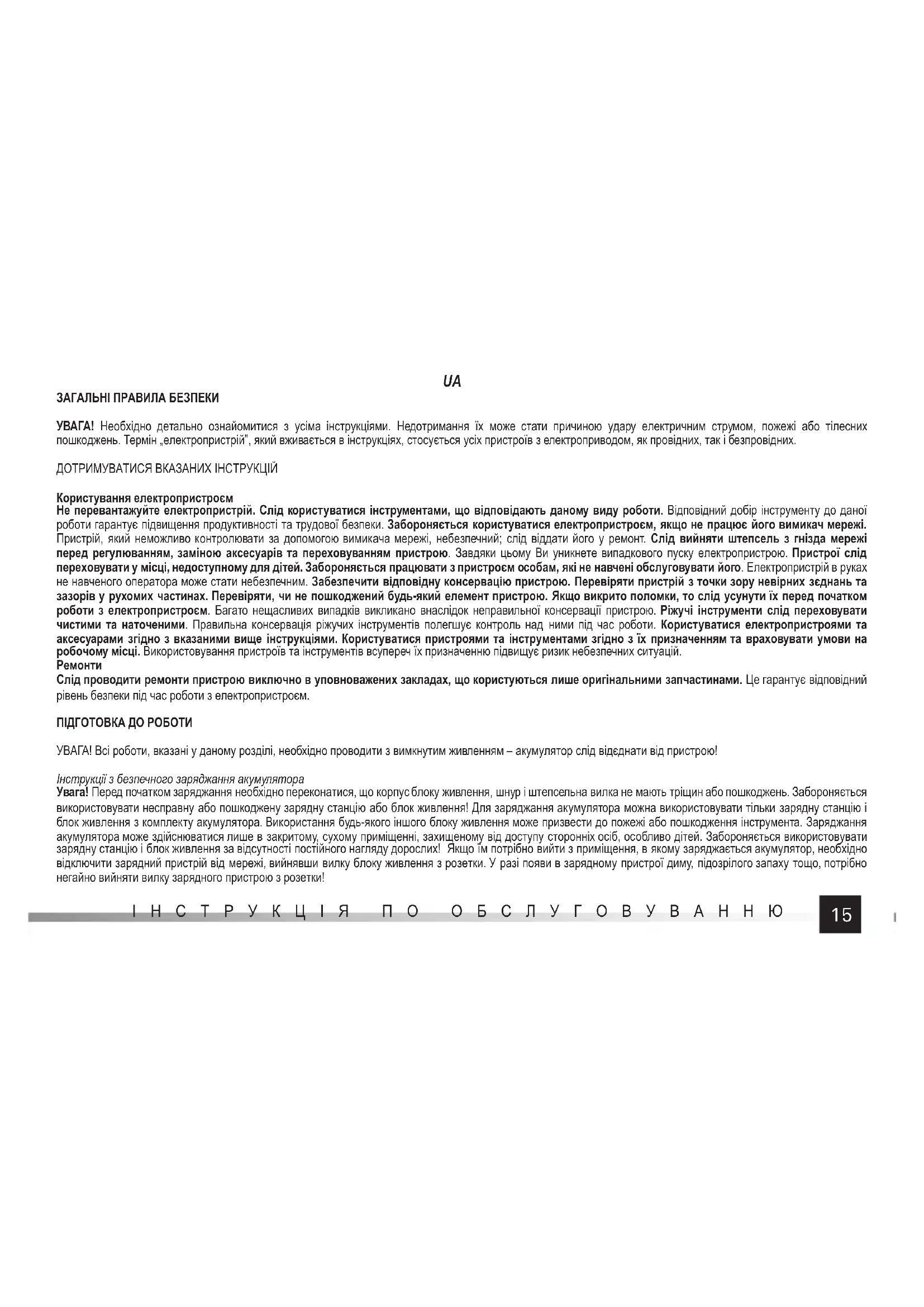 Слід проводити ремонти пристрою виключно в уповноважених закладах, що користуються лише оригінальними запчастинами. Це гарантує відповідний рівень безпеки під час роботи з електропристроєм. ПІДГОТОВКА ДО РОБОТИ УВАГА! Всі роботи, вказані у даному розділі, необхідно проводити з вимкнутим живленням – акумулятор слід відєднати від пристрою! Інструкції з безпечного заряджання акумулятора Увага! Перед початком заряджання необхідно переконатися, що корпус блоку живлення, шнур і штепсельна вилка не мають тріщин або пошкоджень. Забороняється використовувати несправну або пошкоджену зарядну станцію або блок живлення! Для заряджання акумулятора можна використовувати тільки зарядну станцію і блок живлення з комплекту акумулятора. Використання будь-якого іншого блоку живлення може призвести до пожежі або пошкодження інструмента. Заряджання акумулятора може здійснюватися лише в закритому, сухому приміщенні, захищеному від доступу сторонніх осіб, особливо дітей. Забороняється використовувати зарядну станцію і блок живлення за відсутності постійного нагляду дорослих! Якщо їм потрібно вийти з приміщення, в якому заряджається акумулятор, необхідно відключити зарядний пристрій від мережі, вийнявши вилку блоку живлення з розетки. У разі появи в зарядному пристрої диму, підозрілого запаху тощо, потрібно негайно вийняти вилку зарядного пристрою з розетки!
