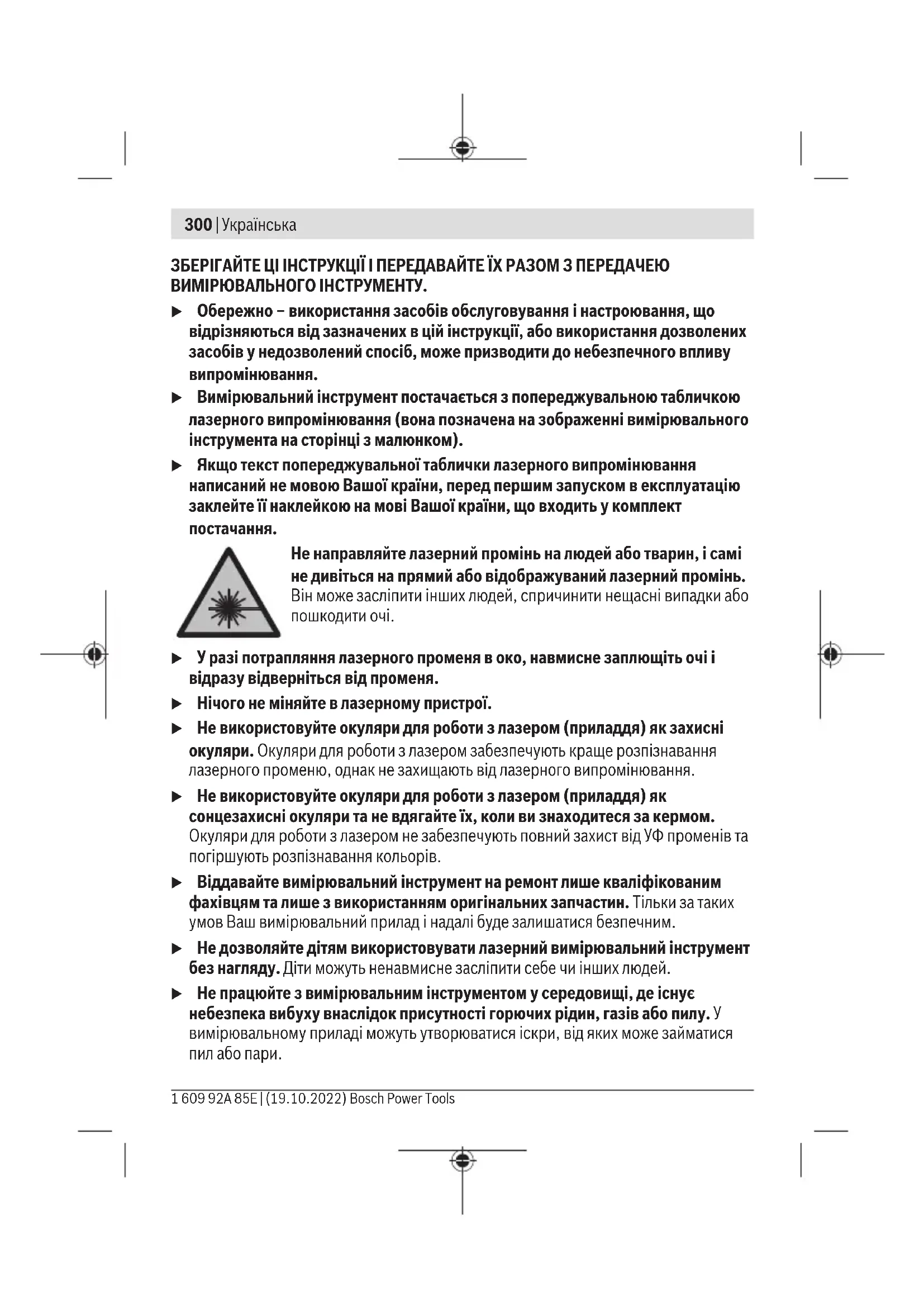 Вказівки з техніки безпеки Прочитайте всі вказівки і дотримуйтеся їх, щоб працювати з вимірювальним інструментом безпечно та надійно. Використання вимірювального інструмента без дотримання цих інструкцій може призвести до пошкодження інтегрованих захисних механізмів. Ніколи не доводьте попереджувальні таблички на вимірювальному інструменті до невпізнанності. ДОБРЕ Bosch Power Tools 1 609 92A 85E | (19.10.2022)300 | Українська ЗБЕРІГАЙТЕ ЦІ ІНСТРУКЦІЇ І ПЕРЕДАВАЙТЕ ЇХ РАЗОМ З ПЕРЕДАЧЕЮ ВИМІРЮВАЛЬНОГО ІНСТРУМЕНТУ. u Обережно – використання засобів обслуговування і настроювання, що відрізняються від зазначених в цій інструкції, або використання дозволених засобів у недозволений спосіб, може призводити до небезпечного впливу випромінювання. u Вимірювальний інструмент постачається з попереджувальною табличкою лазерного випромінювання (вона позначена на зображенні вимірювального інструмента на сторінці з малюнком). u Якщо текст попереджувальної таблички лазерного випромінювання написаний не мовою Вашої країни, перед першим запуском в експлуатацію заклейте її наклейкою на мові Вашої країни, що входить у комплект постачання. Не направляйте лазерний промінь на людей або тварин, і самі не дивіться на прямий або відображуваний лазерний промінь. Він може засліпити інших людей, спричинити нещасні випадки або пошкодити очі. u У разі потрапляння лазерного променя в око, навмисне заплющіть очі і відразу відверніться від променя. u Нічого не міняйте в лазерному пристрої. u Не використовуйте окуляри для роботи з лазером (приладдя) як захисні окуляри. Окуляри для роботи з лазером забезпечують краще розпізнавання лазерного променю, однак не захищають від лазерного випромінювання. u Не використовуйте окуляри для роботи з лазером (приладдя) як сонцезахисні окуляри та не вдягайте їх, коли ви знаходитеся за кермом. Окуляри для роботи з лазером не забезпечують повний захист від УФ променів та погіршують розпізнавання кольорів. u Віддавайте вимірювальний інструмент на ремонт лише кваліфікованим фахівцям та лише з використанням оригінальних запчастин. Тільки за таких умов Ваш вимірювальний прилад і надалі буде залишатися безпечним. u Не дозволяйте дітям використовувати лазерний вимірювальний інструмент без нагляду. Діти можуть ненавмисне засліпити себе чи інших людей. u Не працюйте з вимірювальним інструментом у середовищі, де існує небезпека вибуху внаслідок присутності горючих рідин, газів або пилу. У вимірювальному приладі можуть утворюватися іскри, від яких може займатися пил або пари. 1 609 92A 85E | (19.10.2022) Bosch Power ToolsУкраїнська | 301 u З технологічних причин вимірювальний інструмент не дає стовідсоткової гарантії безпеки. Фактори навколишнього середовища (напр., пил або пара на ділянці вимірювання), температурні перепади (напр., внаслідок роботи тепловентиляторів), а також якість і стан поверхонь вимірювання (напр., матеріали, які дуже віддзеркалюють світло, або прозорі матеріали) можуть негативно вплинути на результати вимірювання. Опис продукту і послуг Будь ласка, дотримуйтеся ілюстрацій на початку інструкції з експлуатації. Призначення приладу Вимірювальний інструмент призначений для безконтактного вимірювання температури поверхні, навколишнього середовища і відносної вологості повітря. Він розраховує температуру точки роси і визначає наяв