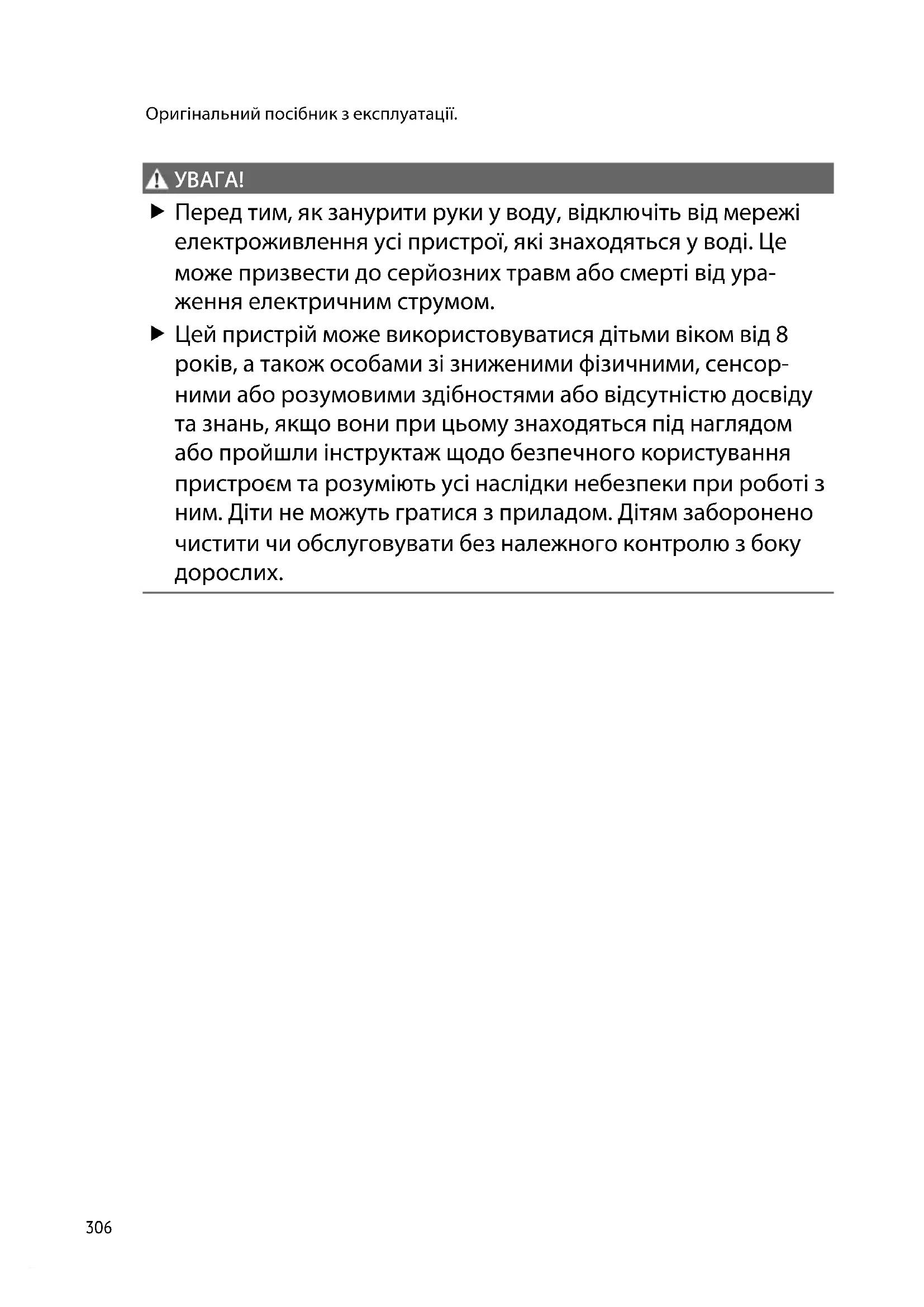 Перед тим, як занурити руки у воду, відключіть від мережі електроживлення усі пристрої, які знаходяться у воді. Це може призвести до серйозних травм або смерті від ура- ження електричним струмом. Цей пристрій може використовуватися дітьми віком від 8 років, а також особами зі зниженими фізичними, сенсор- ними або розумовими здібностями або відсутністю досвіду та знань, якщо вони при цьому знаходяться під наглядом або пройшли інструктаж щодо безпечного користування пристроєм та розуміють усі наслідки небезпеки при роботі з ним. Діти не можуть гратися з приладом. Дітям заборонено чистити чи обслуговувати без належного контролю з боку дорослих.UK