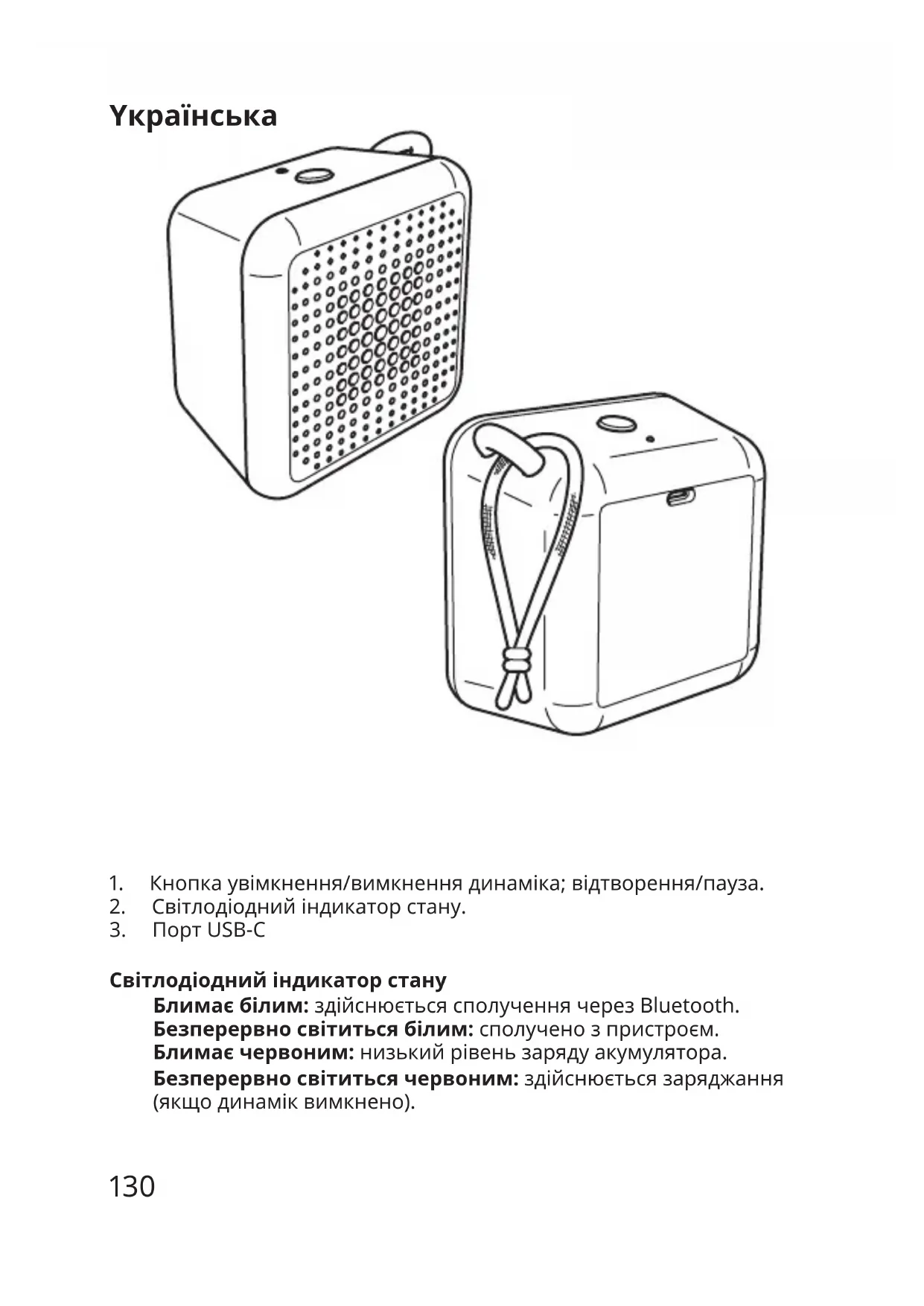 Світлодіоднийіндикаторстану Блимаєбілим:здійснюєтьсясполученнячерезBluetooth. Безперервносвітитьсябілим:сполученозпристроєм. Блимаєчервоним:низькийрівеньзарядуакумулятора. Безперервносвітитьсячервоним:здійснюєтьсязаряджання (якщодинаміквимкнено). Yкраїнська131 Початокроботи ПідключітькабельUSB-Cдовхідногопорту,аіншийкінець— доджерелаживлення(докомп'ютераабоблокуживлення), щобзарядитивирібпередпершимвикористанняміщоразу, колисвітлодіодблимаєчервоним,повідомляючипронизький зарядакумулятора.Підчасзаряджаннясвітлодіоднийіндикатор безперервносвітитиметьсячервоним(якщодинаміквимкнено)і вимкнеться,колиакумуляторбудеповністюзаряджено. Рекомендованийблокживлення: 5,0Впостійногоструму,1,0А(невходитьукомплект) Функціїдинаміка Увімкнення/вимкнення Натиснітьіутримуйтекнопкуживлення(1),щобувімкнутичи вимкнутидинамік. Відтворення/пауза Короткенатисканнякнопкиживленняпризведедовідтворення абопризупиненнявідтвореннямузики. Автоматичневимкнення Якщодинамікнесполученозпристроєм,вінавтоматично вимкнетьсяза5хвилин.Якщосполучитидинамікізпристроємі невідтворюватичерезньогомузику,вінавтоматичновимкнеться за20хвилин. Bluetooth-сполучення Щобсполучитидинамікізвихіднимпристроєм,йогопотрібно перевестиврежимBluetooth-сполучення.Щобустановити сполучення,відкрийтеналаштуванняBluetoothнавихідному пристроїтапідключітьсядодинаміка«VAPPEBYPortable». ДинамікавтоматичнопереходитьурежимBluetooth-сполученняпід часпершоговвімкненнятащоразу,колиневдаєтьсязнайтираніше сполученийпристрій. Скиданнядозаводськихналаштувань ЩобвидалитипопередніBluetooth-сполучення,скиньте налаштуваннядинаміка.Дляцьогонатиснітьіутримуйтекнопку (1)понад5секунд.Післяуспішноговідновленнязаводських132 налаштуваньсвітлодіоднийіндикаторзаблимаєчервонимібуде відтворенозвуковийсигнал. ТакожможнаперейтивменюBluetoothнавихідномупристроїта розірватисполучення. Стерео-сполучення ДвапортативніпристроїVAPPEBYможнасполучитидлястворення стереоефекту. 1.Переконайтеся,щообидвадинамікиперебуваютьурежимі пошукуBluetooth-сполучення. 2.Двічінатиснітькнопкуживленнянаодномуздинаміків.Після успішногостерео-сполученнябудевідтворенозвуковийсигнал. 3.Підключітьсядовихідногопристрою,дотримуючисьінструкційіз Bluetooth-сполучення. Кориснаінформація