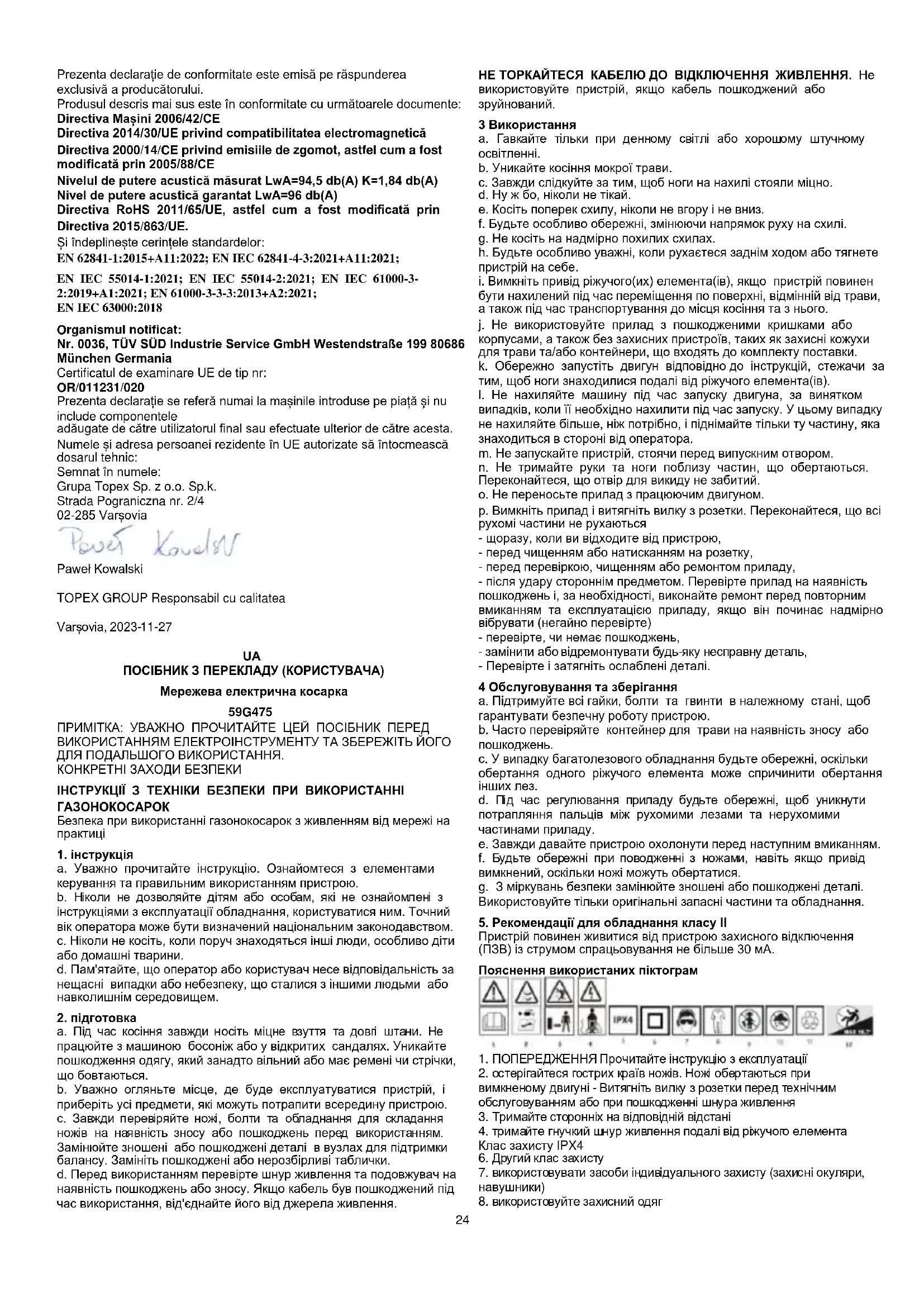 бути нахилений під час переміщення по поверхні, відмінній від трави, а також під час транспортування до місця косіння та з нього. j. Не використовуйте прилад з пошкодженими кришками або корпусами, а також без захисних пристроїв, таких як захисні кожухи для трави та/або контейнери, що входять до комплекту поставки. k. Обережно запустіть двигун відповідно до інструкцій, стежачи за тим, щоб ноги знаходилися подалі від ріжучого елемента(ів). l. Не нахиляйте машину під час запуску двигуна, за винятком випадків, коли її необхідно нахилити під час запуску. У цьому випадку не нахиляйте більше, ніж потрібно, і піднімайте тільки ту частину, яка знаходиться в стороні від оператора. m. Не запускайте пристрій, стоячи перед випускним отвором. n. Не тримайте руки та ноги поблизу частин, що обертаються. Переконайтеся, що отвір для викиду не забитий. o. Не переносьте прилад з працюючим двигуном. p. Вимкніть прилад і витягніть вилку з розетки. Переконайтеся, що всі рухомі частини не рухаються - щоразу, коли ви відходите від пристрою, - перед чищенням або натисканням на розетку, - перед перевіркою, чищенням або ремонтом приладу, - після удару стороннім предметом. Перевірте прилад на наявність пошкоджень і, за необхідності, виконайте ремонт перед повторним вмиканням та експлуатацією приладу, якщо він починає надмірно вібрувати (негайно перевірте) - перевірте, чи немає пошкоджень, - замінити або відремонтувати будь-яку несправну деталь, - Перевірте і затягніть ослаблені деталі. 4 Обслуговування та зберігання a. Підтримуйте всі гайки, болти та гвинти в належному стані, щоб гарантувати безпечну роботу пристрою. b. Часто перевіряйте контейнер для трави на наявність зносу або пошкоджень. c. У випадку багатолезового обладнання будьте обережні, оскільки обертання одного ріжучого елемента може спричинити обертання