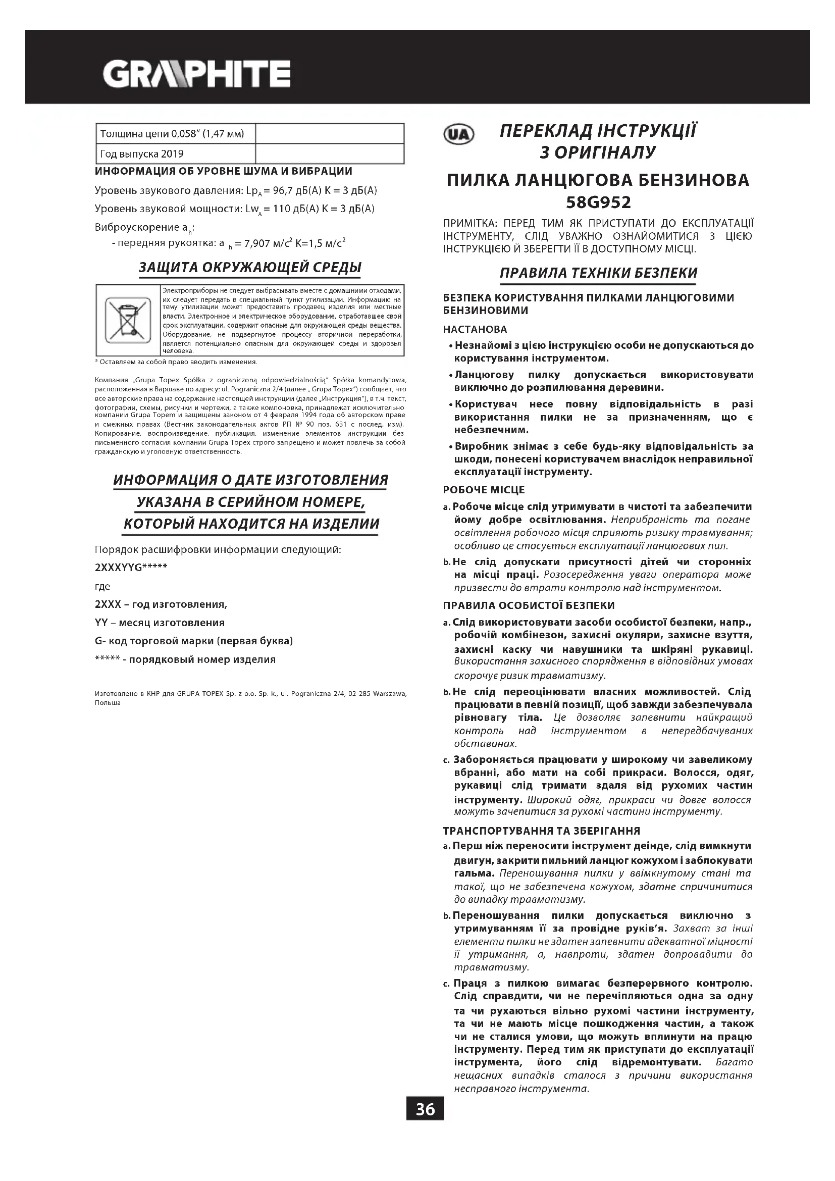 ПЕРЕКЛАД ІНСТРУКЦІЇ З ОРИГІНАЛУ ПИЛКА ЛАНЦЮГОВА БЕНЗИНОВА 58G952 ПРИМІТКА: ПЕРЕД ТИМ ЯК ПРИСТУПАТИ ДО ЕКСПЛУАТАЦІЇ ІНСТРУМЕНТУ, СЛІД УВАЖНО ОЗНАЙОМИТИСЯ З ЦІЄЮ ІНСТРУКЦІЄЮ Й ЗБЕРЕГТИ ЇЇ В ДОСТУПНОМУ МІСЦІ. ПРАВИЛА ТЕХНІКИ БЕЗПЕКИ БЕЗПЕКА КОРИСТУВАННЯ ПИЛКАМИ ЛАНЦЮГОВИМИ БЕНЗИНОВИМИ