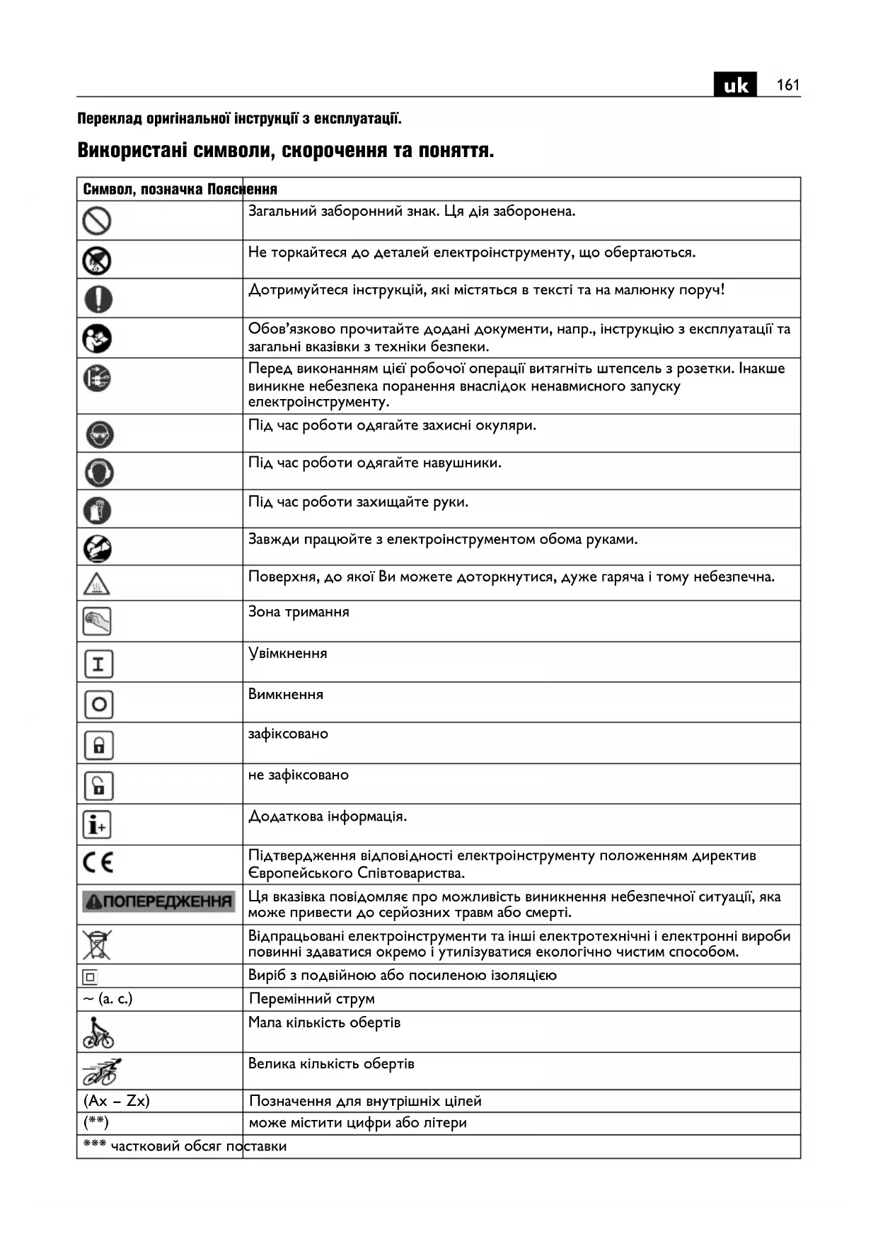 зафіксовано не зафіксовано Додаткова інформація. Підтвердження відпові дності електроінструменту положенням директив Європейського Співтовариства. Ця вказівка повідомляє про можливість виникнення небезпечної ситуації, яка може привести до серйозних травм або смерті. Відпрацьовані електроінструменти та інші електротехнічні і електронні вироби повинні здаватися окремо і утилізуватися екологічно чистим способом. Виріб з подвійною або посиленою ізоляцією ~ (a. c.) Перемінний струм Мала кількість обертів Велика кількість обертів (Ax – Zx) Позначення для внутрішніх цілей (**) може містити цифри або літери *** частковий обсяг поставки162