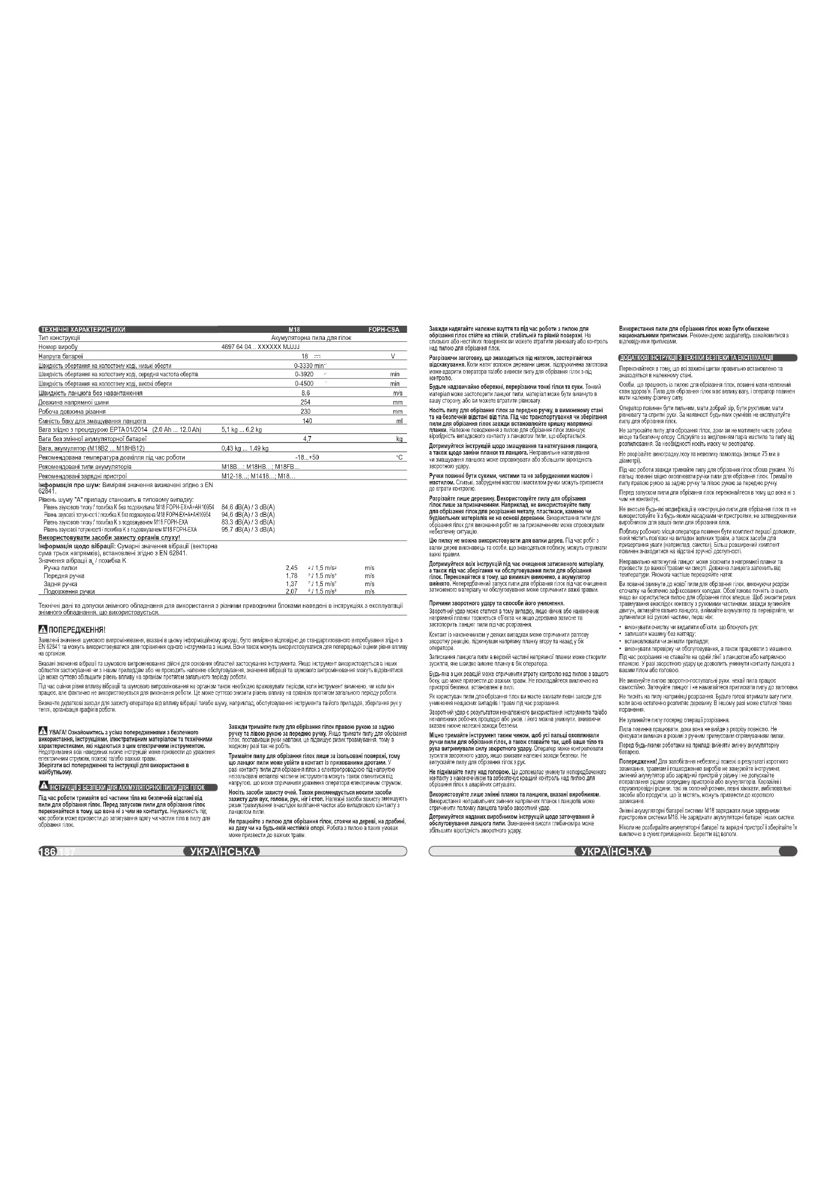 УКРАЇНСЬКАУКРАЇНСЬКА ТЕХНІЧНІ ХАРАКТЕРИСТИКИ Тип конструкції Номер виробу Напруга батареї Швидкість обертання на холостому ході, низькі оберти Швидкість обертання на холостому ході, cередня частота обертів Швидкість обертання на холостому ході, високі оберти Швидкість ланцюга без навантаження Довжина напрямної шини Робоча довжина різання Ємність баку для змащування ланцюга Вага згідно з процедурою EPTA 01/2014 (2.0 Ah ... 12.0 Ah) Вага без змінної акумуляторної батареї Вага, акумулятор (M18B2 ... M18HB12) Рекомендована температура довкілля під час роботи Рекомендовані типи акумуляторів Рекомендовані зарядні пристрої Інформація про шум: Виміряні значення визначені згідно з EN