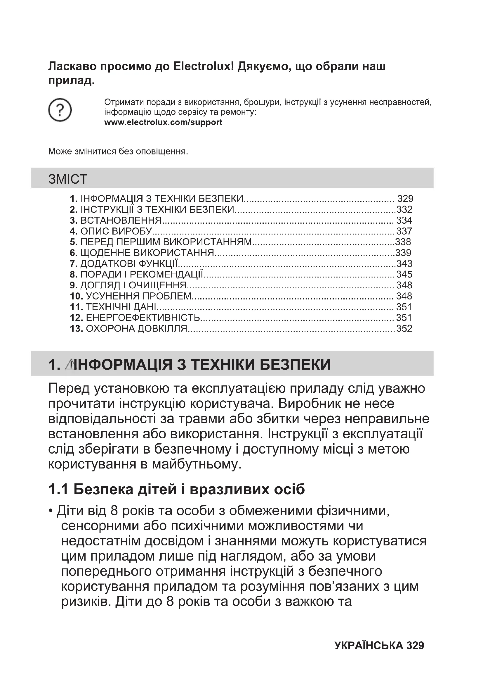Отримати поради з використання, брошури, інструкції з усунення несправностей,інформацію щодо сервісу та ремонту:www.electrolux.com/supportМоже змінитися без оповіщення. 1. ІНФОРМАЦІЯ З ТЕХНІКИ БЕЗПЕКИ........................................................ 3292. ІНСТРУКЦІЇ З ТЕХНІКИ БЕЗПЕКИ............................................................332