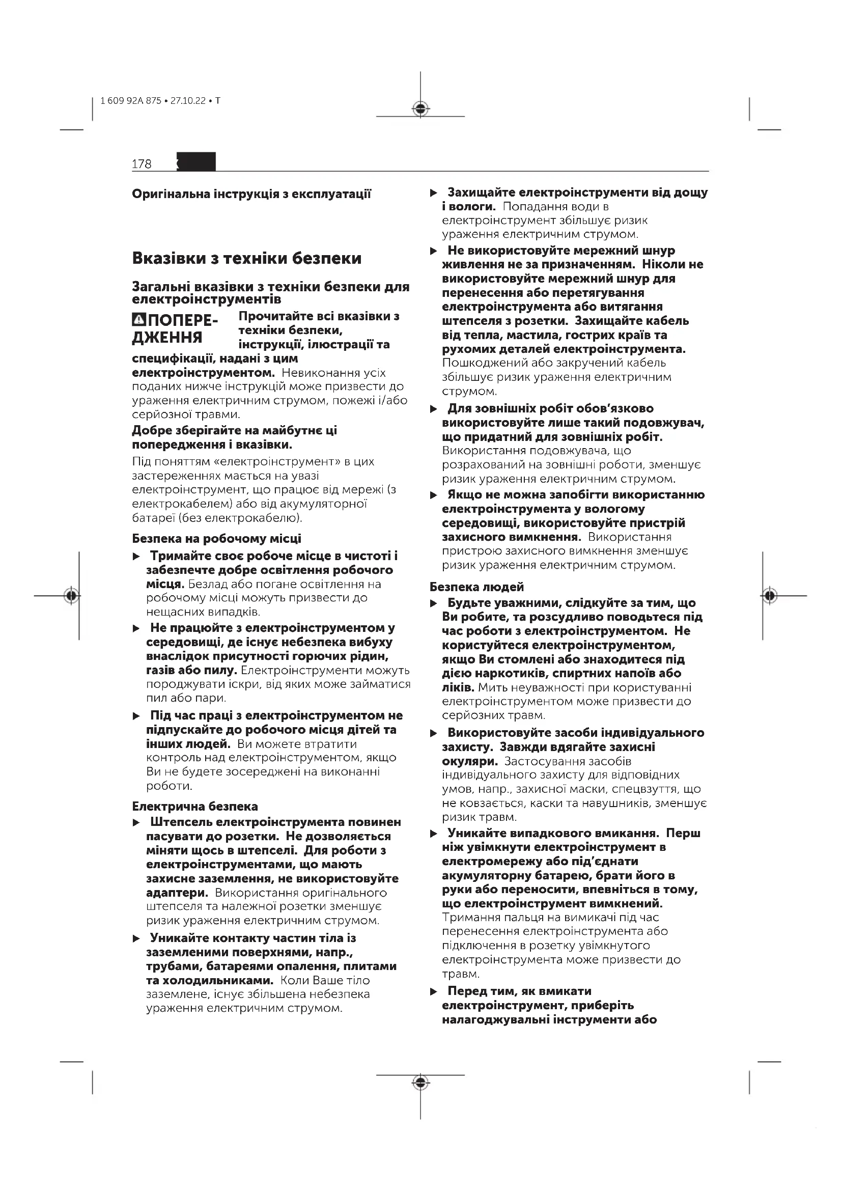 Правильне поводження та користування електроінструментамиУкраїнська u Не перевантажуйте електроінструмент. Використовуйте такий електроінструмент, що спеціально призначений для відповідної роботи. Зпридатним електроінструментом Ви з меншим ризиком отримаєте кращі результати роботи, якщо будете працювати в зазначеному діапазоні потужності. u Не користуйтеся електроінструментом з пошкодженим вимикачем. Електроінструмент, який не вмикається або не вимикається, є небезпечним і його треба відремонтувати. u Перед тим, як регулювати що-небудь в електроінструменті, міняти приладдя або ховати електроінструмент, витягніть штепсель із розетки та/або витягніть акумуляторну батарею. Ці попереджувальні заходи з техніки безпеки зменшують ризик випадкового запуску електроінструмента. u Ховайте електроінструменти, якими Ви саме не користуєтеся, від дітей. Не дозволяйте користуватися електроінструментом особам, що не знайомі з його роботою або не читали ці вказівки. Використання електроінструментів недосвідченими особами може бути небезпечним. u Старанно доглядайте за електроінструментами і приладдям. Перевіряйте, щоб рухомі деталі електроінструмента були правильно розташовані та не заїдали, не були пошкодженими або у будь-якому іншому стані, який міг би вплинути на функціонування електроінструмента. Пошкоджені електроінструменти потрібно відремонтувати, перш ніж користуватися ними знову. Велика кількість нещасних випадків спричиняється поганим доглядом за електроінструментами. u Тримайте різальні інструменти нагостреними та в чистоті. Старанно доглянуті різальні інструменти з гострим різальним краєм менше застряють та легші в експлуатації. u Використовуйте електроінструмент, приладдя до нього, робочі інструменти тощо відповідно до цих вказівок. Беріть до уваги при цьому умови роботи та специфіку виконуваної роботи. Використання електроінструментів для робіт, для яких вони не передбачені, може призвести до небезпечних ситуацій. u Тримайте рукоятки і поверхні захвату сухими і чистими, слідкуйте, щоб на них не було оливи або густого мастила. Слизькі рукоятки і поверхні захвату унеможливлюють безпечне поводження з електроінструментом та його контролювання в неочікуваних ситуаціях. Правильне поводження та користування електроінструментами, що працюють на акумуляторних батареяхУкраїнська u Заряджайте акумуляторні батареї лише в заряджувальних пристроях, рекомендованих виготовлювачем. Використання заряджувального пристрою для акумуляторних батарей, для яких він не передбачений, може призводити до пожежі. u Використовуйте в електроінструментах лише рекомендовані акумуляторні батареї. Використання інших акумуляторних батарей може призводити до травм та пожежі. u Не зберігайте акумуляторну батарею, якою Ви саме не користуєтеся, поряд із канцелярськими скріпками, ключами, цвяхами, гвинтами та іншими невеликими металевими предметами, які можуть спричинити перемикання контактів. Коротке замикання між контактами uk 179 1 609 92A 875 • 27.10.22 • Tакумуляторної батареї може спричиняти опіки або пожежу. u При неправильному використанні з акумуляторної батареї може потекти рідина. Уникайте контакту з нею. При випадковому контакті промийте відповідне місце водою. Якщо рідина потрапила в очі, додатково зверніться до лікаря.