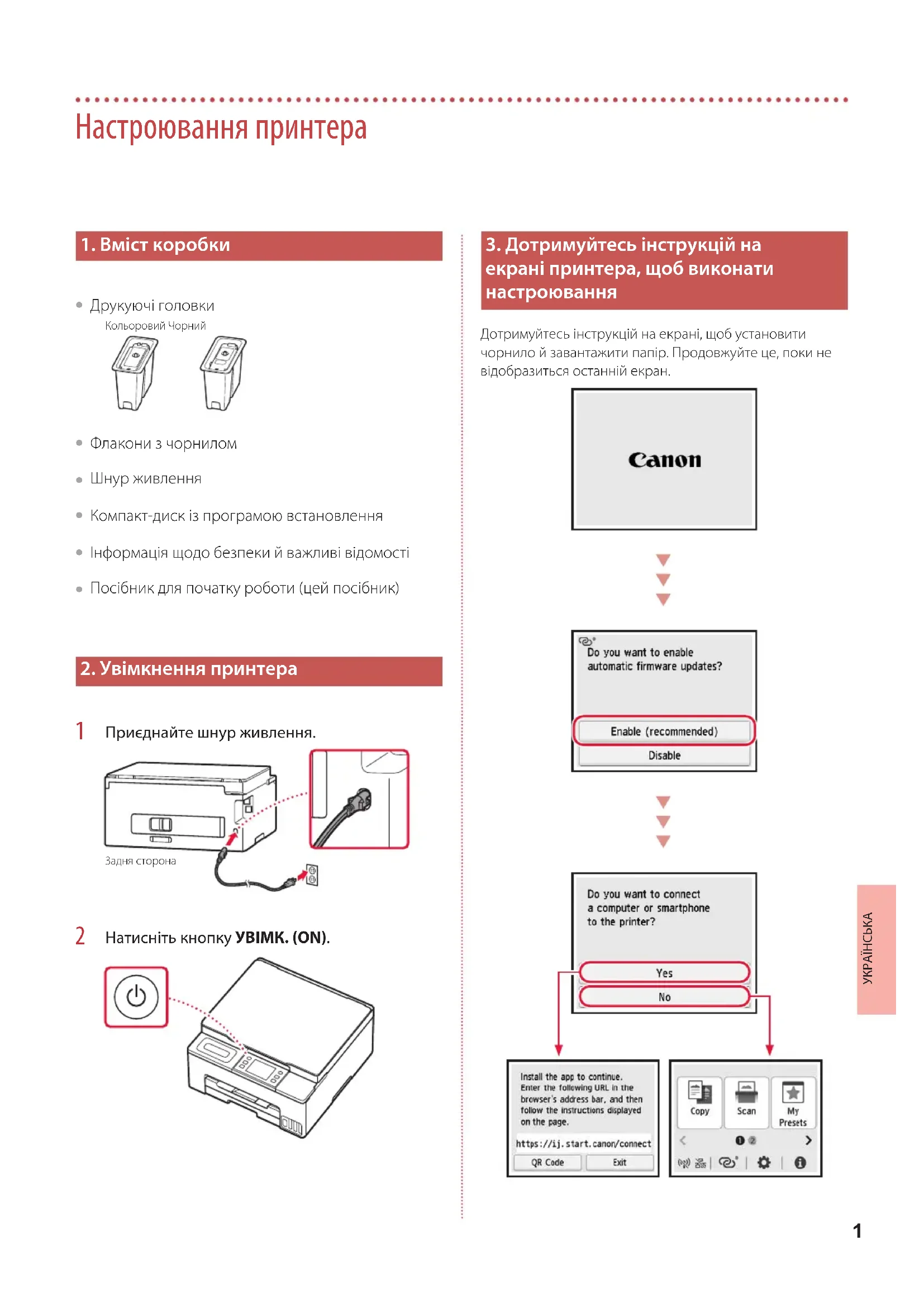 екрані принтера, щоб виконати настроювання Дотримуйтесь інструкцій на екрані, щоб установити чорнило й завантажити папір. Продовжуйте це, поки не відобразиться останній екран.2 Настроювання принтера