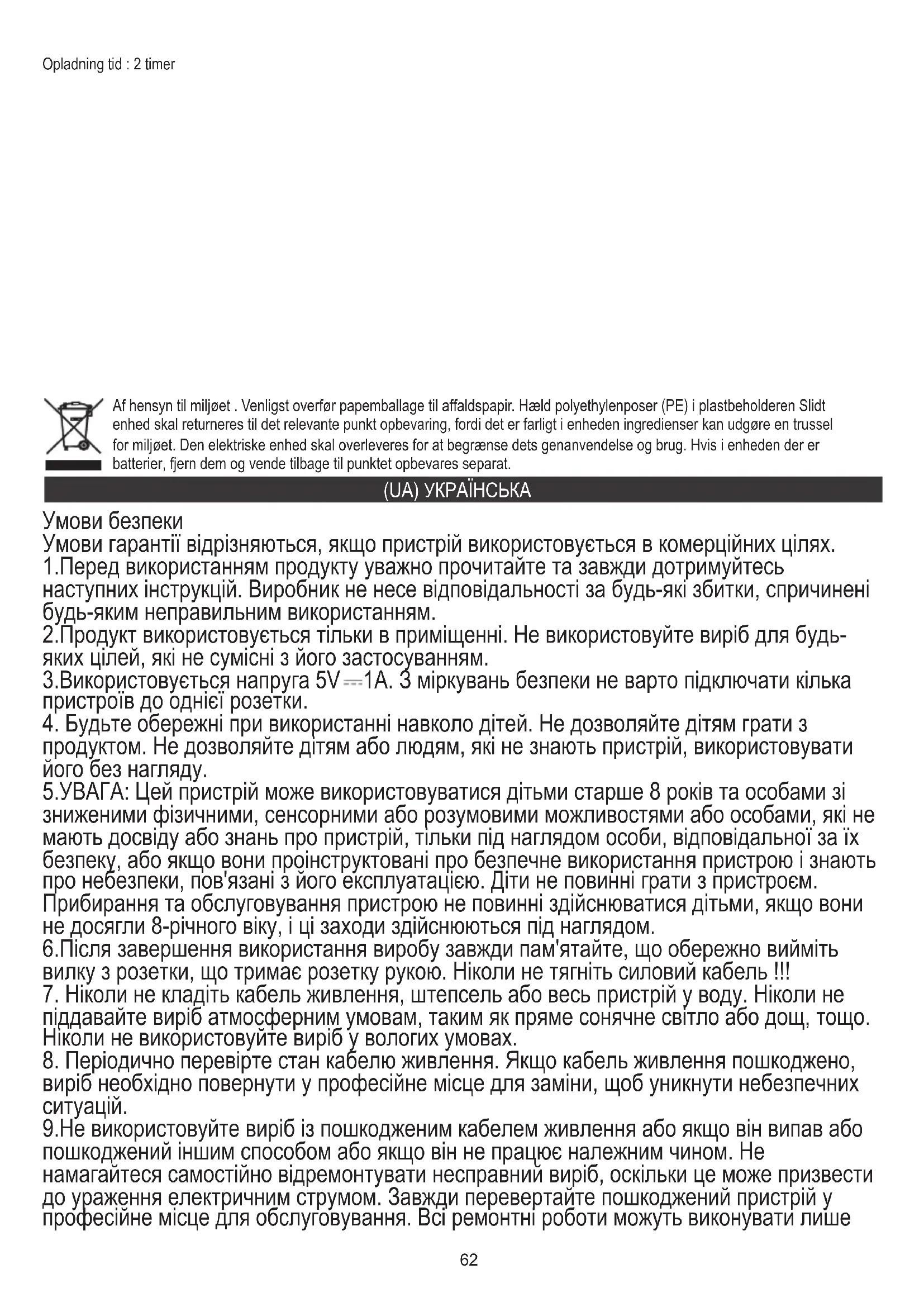 Opladning tid : 2 timer Af hensyn til miljøet . Venligst overfør papemballage til affaldspapir. Hæld polyethylenposer (PE) i plastbeholderen Slidt enhed skal returneres til det relevante punkt opbevaring, fordi det er farligt i enheden ingredienser kan udgøre en trussel for miljøet. Den elektriske enhed skal overleveres for at begrænse dets genanvendelse og brug. Hvis i enheden der er batterier, fjern dem og vende tilbage til punktet opbevares separat. (UA) УКРАЇНСЬКА Умови безпеки Умови гарантії відрізняються, якщо пристрій використовується в комерційних цілях. 1.Перед використанням продукту уважно прочитайте та завжди дотримуйтесь наступних інструкцій. Виробник не несе відповідальності за будь-які збитки, спричинені будь-яким неправильним використанням. 2.Продукт використовується тільки в приміщенні. Не використовуйте виріб для будь- яких цілей, які не сумісні з його застосуванням. 3.Використовується напруга 5V 1A. З міркувань безпеки не варто підключати кілька пристроїв до однієї розетки.