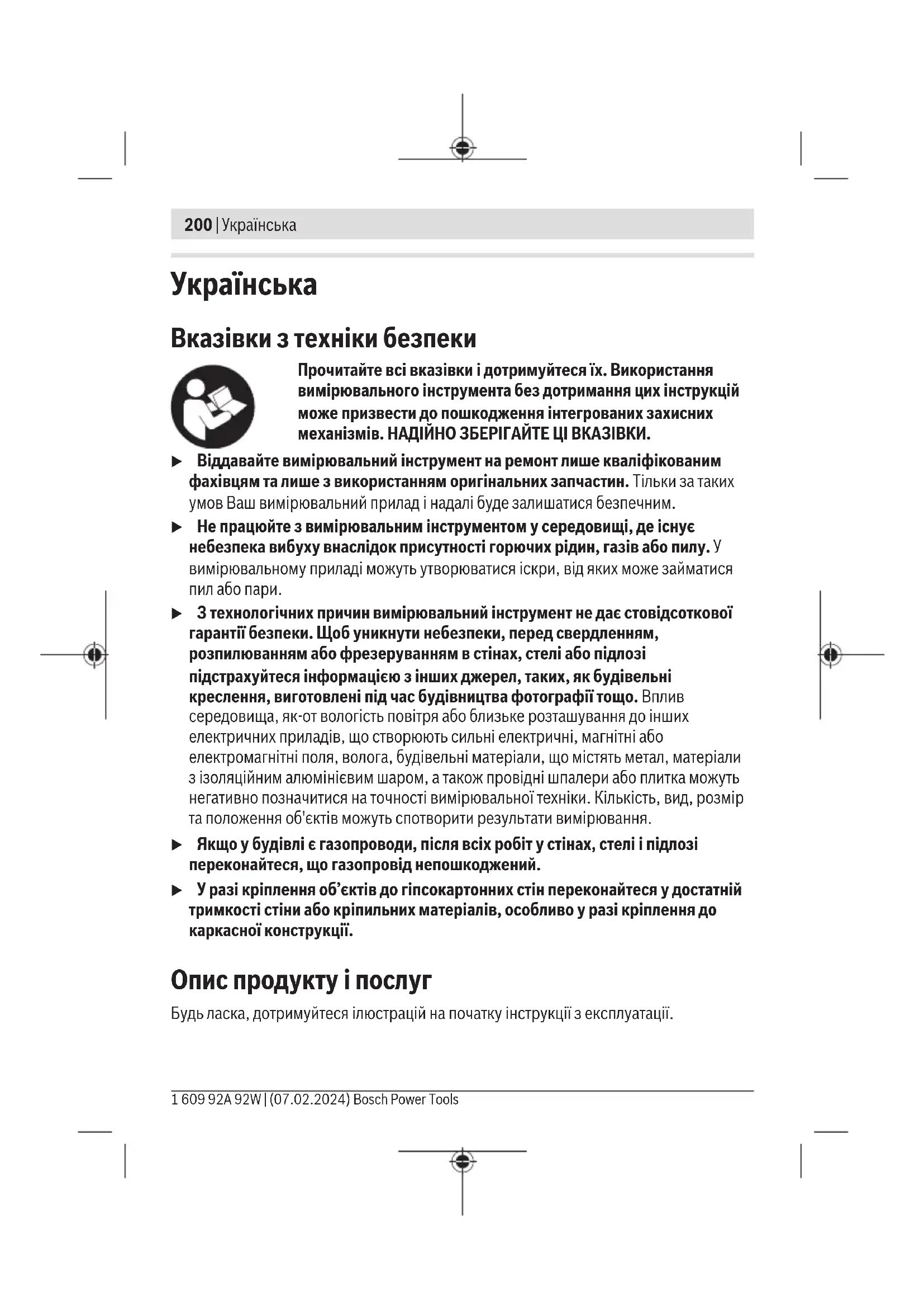Вказівки з техніки безпеки Прочитайте всі вказівки і дотримуйтеся їх. Використання вимірювального інструмента без дотримання цих інструкцій може призвести до пошкодження інтегрованих захисних механізмів. НАДІЙНО ЗБЕРІГАЙТЕ ЦІ ВКАЗІВКИ. u Віддавайте вимірювальний інструмент на ремонт лише кваліфікованим фахівцям та лише з використанням оригінальних запчастин. Тільки за таких умов Ваш вимірювальний прилад і надалі буде залишатися безпечним. u Не працюйте з вимірювальним інструментом у середовищі, де існує небезпека вибуху внаслідок присутності горючих рідин, газів або пилу. У вимірювальному приладі можуть утворюватися іскри, від яких може займатися пил або пари. u З технологічних причин вимірювальний інструмент не дає стовідсоткової гарантії безпеки. Щоб уникнути небезпеки, перед свердленням, розпилюванням або фрезеруванням в стінах, стелі або підлозі підстрахуйтеся інформацією з інших джерел, таких, як будівельні креслення, виготовлені під час будівництва фотографії тощо. Вплив середовища, як-от вологість повітря або близьке розташування до інших електричних приладів, що створюють сильні електричні, магнітні або електромагнітні поля, волога, будівельні матеріали, що містять метал, матеріали з ізоляційним алюмінієвим шаром, а також провідні шпалери або плитка можуть негативно позначитися на точності вимірювальної техніки. Кількість, вид, розмір та положення об'єктів можуть спотворити результати вимірювання. u Якщо у будівлі є газопроводи, після всіх робіт у стінах, стелі і підлозі переконайтеся, що газопровід непошкоджений. u У разі кріплення об’єктів до гіпсокартонних стін переконайтеся у достатній тримкості стіни або кріпильних матеріалів, особливо у разі кріплення до каркасної конструкції. Опис продукту і послуг Будь ласка, дотримуйтеся ілюстрацій на початку інструкції з експлуатації. 1 609 92A 92W | (07.02.2024) Bosch Power ToolsУкраїнська | 201 Призначення приладу Вимірювальний інструмент призначений для пошуку металів (чорних та кольорових металів, наприклад, арматурного заліза), а також проводки під напругою у стінах, стелі та підлозі. Вимірювальний прилад придатний для робіт всередині приміщень та надворі. Зображені компоненти Нумерація зображених компонентів посилається на зображення вимірювального приладу на сторінці з малюнком. (1) Індикація центру об’єкта (2) Світлове кільце (3) Отвір для маркування (4) Індикація проводки під напругою (5) Індикація металевого об'єкту (6) Кнопка звукового сигналу (7) Кнопка увімкнення/вимкнення (8) Поверхня рукоятки (9) Захисна сумка (10)