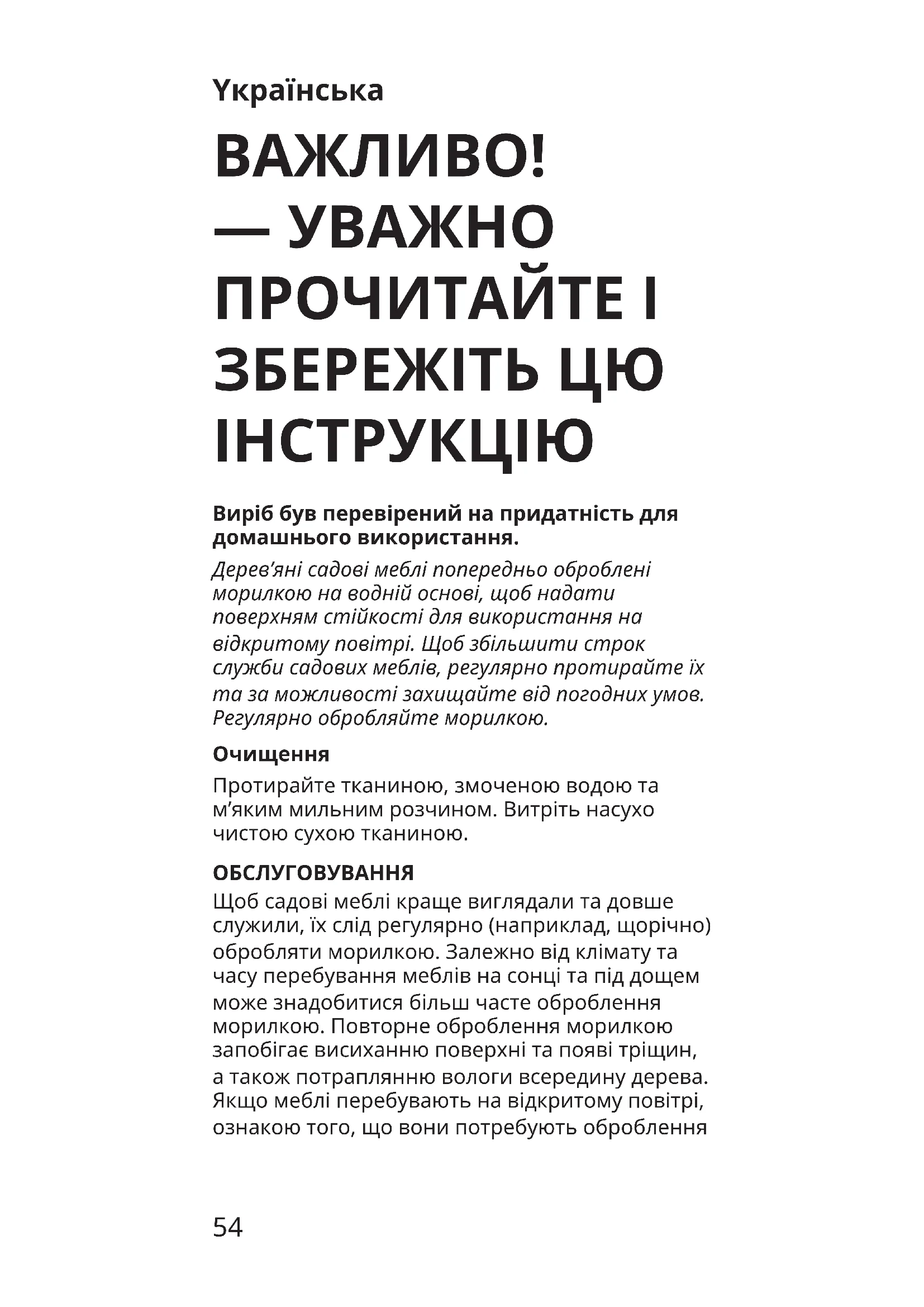 Протирайте тканиною, змоченою водою та м’яким мильним розчином. Витріть насухо чистою сухою тканиною. ОБСЛУГОВУВАННЯ Щоб садові меблі краще виглядали та довше служили, їх слід регулярно (наприклад, щорічно) обробляти морилкою. Залежно від клімату та часу перебування меблів на сонці та під дощем може знадобитися більш часте оброблення морилкою. Повторне оброблення морилкою запобігає висиханню поверхні та появі тріщин, а також потраплянню вологи всередину дерева. Якщо меблі перебувають на відкритому повітрі, ознакою того, що вони потребують оброблення55 морилкою, є поглинання деревом дощових крапель замість утворення дрібних крапель на