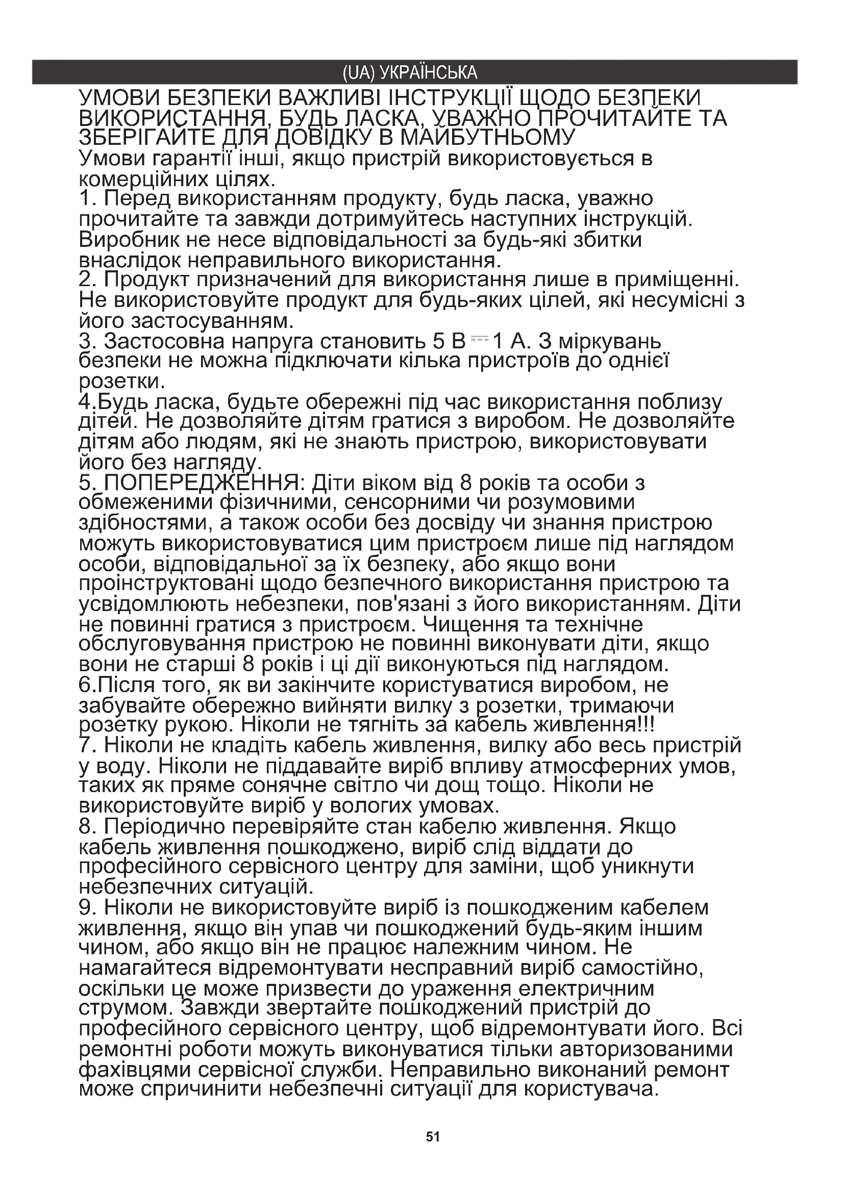 прочитайте та завжди дотримуйтесь наступних інструкцій. Виробник не несе відповідальності за будь-які збитки внаслідок неправильного використання. УМОВИ БЕЗПЕКИ ВАЖЛИВІ ІНСТРУКЦІЇ ЩОДО БЕЗПЕКИ ВИКОРИСТАННЯ, БУДЬ ЛАСКА, УВАЖНО ПРОЧИТАЙТЕ ТА ЗБЕРІГАЙТЕ ДЛЯ ДОВІДКУ В МАЙБУТНЬОМУ