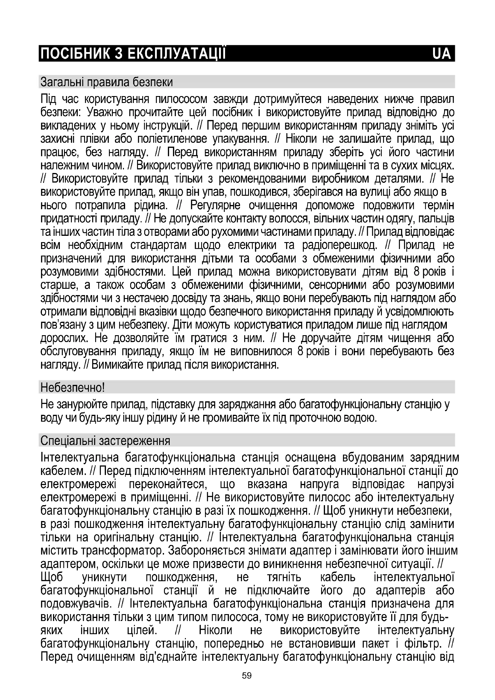 58ПОСІБНИК З ЕКСПЛУАТАЦІЇ UA Загальні правила безпеки Під час користування пилососом завжди дотримуйтеся наведених нижче правил безпеки: Уважно прочитайте цей посібник і використовуйте прилад відповідно до викладених у ньому інструкцій. // Перед першим використанням приладу зніміть усі захисні плівки або поліетиленове упакування. // Ніколи не залишайте прилад, що працює, без нагляду. // Перед використанням приладу зберіть усі його частини належним чином. // Використовуйте прилад виключно в приміщенні та в сухих місцях. // Використовуйте прилад тільки з рекомендованими виробником деталями. // Не використовуйте прилад, якщо він упав, пошкодився, зберігався на вулиці або якщо в нього потрапила рідина. // Регулярне очищення допоможе подовжити термін придатності приладу. // Не допускайте контакту волосся, вільних частин одягу, пальців та інших частин тіла з отворами або рухомими частинами приладу. // Прилад відповідає всім необхідним стандартам щодо електрики та радіоперешкод. // Прилад не призначений для використання дітьми та особами з обмеженими фізичними або розумовими здібностями. Цей прилад можна використовувати дітям від 8 років і старше, а також особам з обмеженими фізичними, сенсорними або розумовими здібностями чи з нестачею досвіду та знань, якщо вони перебувають під наглядом або отримали відповідні вказівки щодо безпечного використання приладу й усвідомлюють пов’язану з цим небезпеку. Діти можуть користуватися приладом лише під наглядом дорослих. Не дозволяйте їм гратися з ним. // Не доручайте дітям чищення або обслуговування приладу, якщо їм не виповнилося 8 років і вони перебувають без нагляду. // Вимикайте прилад після використання. Небезпечно! Не занурюйте прилад, підставку для заряджання або багатофункціональну станцію у воду чи будь-яку іншу рідину й не промивайте їх під проточною водою. Спеціальні застереження Інтелектуальна багатофункціональна станція оснащена вбудованим зарядним кабелем. // Перед підключенням інтелектуальної багатофункціональної станції до електромережі переконайтеся, що вказана напруга відповідає напрузі електромережі в приміщенні. // Не використовуйте пилосос або інтелектуальну багатофункціональну станцію в разі їх пошкодження. // Щоб уникнути небезпеки, в разі пошкодження інтелектуальну багатофункціональну станцію слід замінити тільки на оригінальну станцію. // Інтелектуальна багатофункціональна станція містить трансформатор. Забороняється знімати адаптер і замінювати його іншим адаптером, оскільки це може призвести до виникнення небезпечної ситуації. // Щоб уникнути пошкодження, не тягніть кабель інтелектуальної багатофункціональної станції й не підключайте його до адаптерів або подовжувачів. // Інтелектуальна багатофункціональна станція призначена для використання тільки з цим типом пилососа, тому не використовуйте її для будь- яких інших цілей. // Ніколи не використовуйте інтелектуальну багатофункціональну станцію, попередньо не встановивши пакет і фільтр. // Перед очищенням від'єднайте інтелектуальну багатофункціональну станцію від 59електромережі. // Заряджайте пилосос тільки за допомогою інтелектуальної багатофункціональної станції. // Пилосос не можна вмикати під час його заряджання на інтелектуальній багатофункціональній станції. // Ніколи не використовуйте п