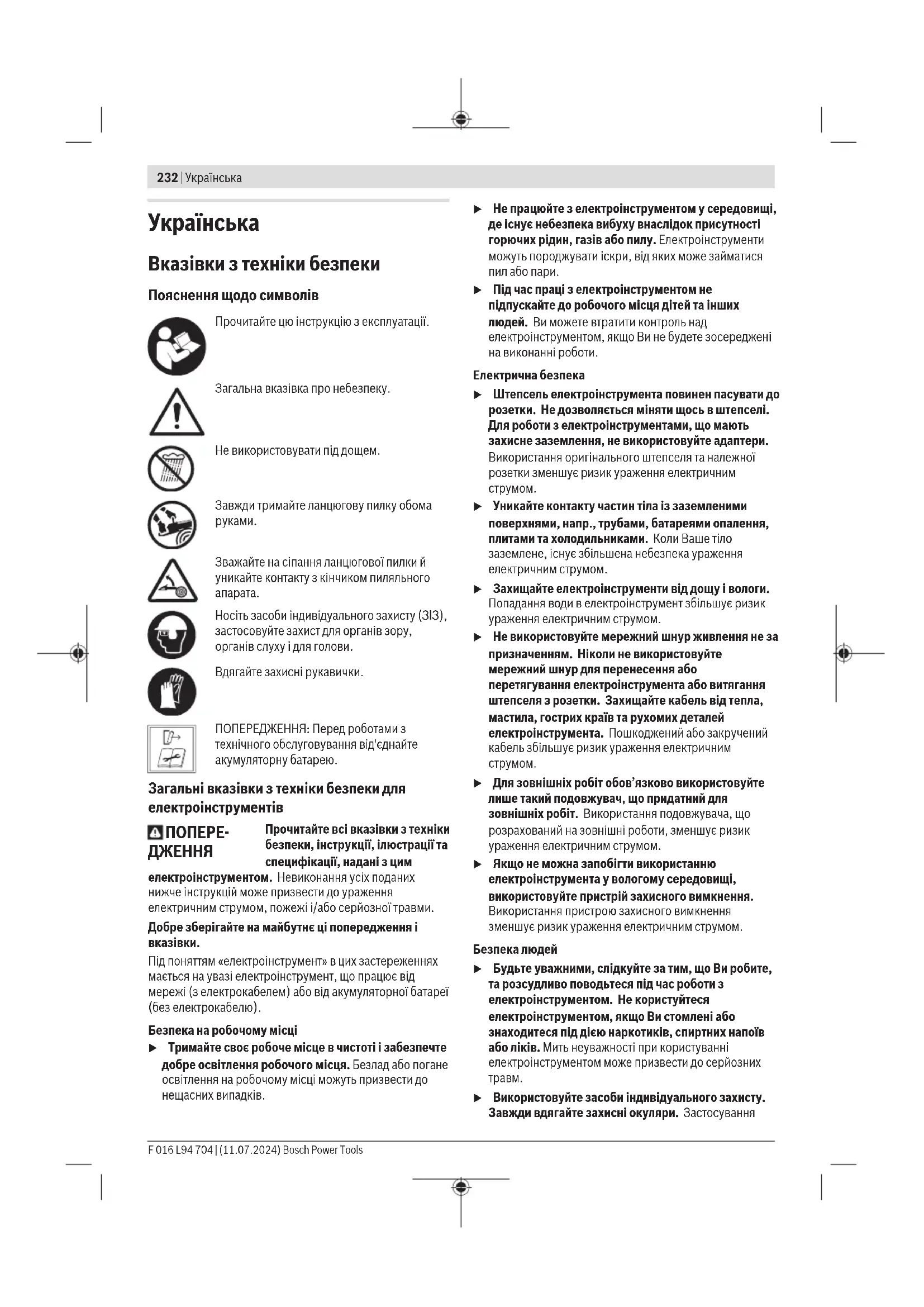 u Використовуйте засоби індивідуального захисту. Завжди вдягайте захисні окуляри. Застосування F 016 L94 704 | (11.07.2024) Bosch Power ToolsУкраїнська | 233 засобів індивідуального захисту для відповідних умов, напр.,захисної маски, спецвзуття, що не ковзається, каски та навушників, зменшує ризик травм. u Уникайте випадкового вмикання. Перш ніж увімкнути електроінструмент в електромережу або під’єднати акумуляторну батарею, брати його в руки або переносити, впевніться в тому, що електроінструмент вимкнений. Тримання пальця на вимикачі під час перенесення електроінструмента або підключення в розетку увімкнутого електроінструмента може призвести до травм. u Перед тим, як вмикати електроінструмент, приберіть налагоджувальні інструменти або гайковий ключ. Перебування налагоджувального інструмента або ключа в частині електроінструмента, що обертається, може призвести до травм. u Уникайте неприродного положення тіла. Завжди зберігайте стійке положення та тримайте рівновагу. Це дозволить Вам краще контролювати електроінструмент у небезпечних ситуаціях. u Вдягайте придатний одяг. Не вдягайте просторий одяг та прикраси. Не підставляйте волосся й одяг до деталей, що рухаються. Просторий одяг, довге волосся та прикраси можуть потрапити в деталі, що