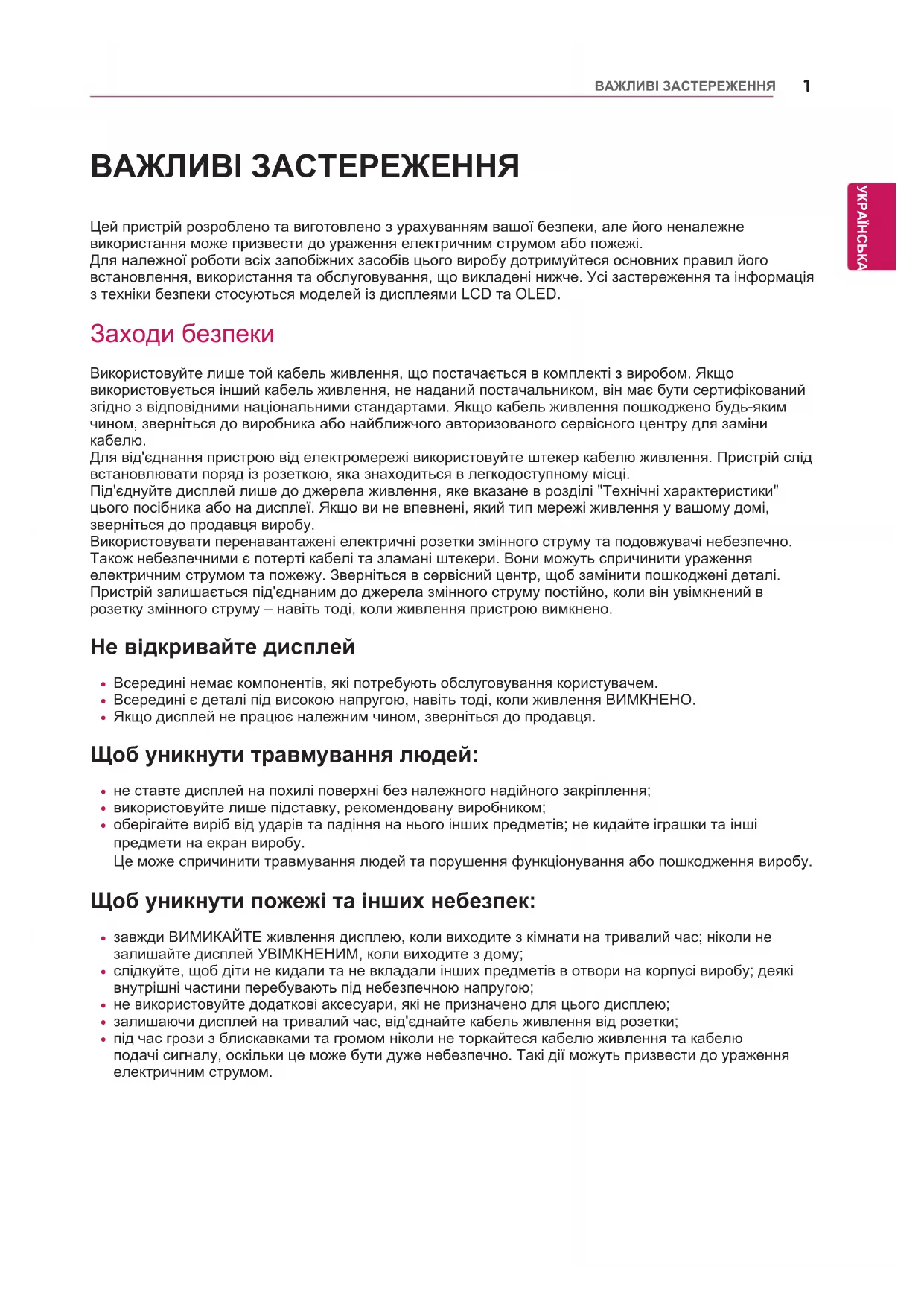 Цей пристрій розроблено та виготовлено з урахуванням вашої безпеки, але його неналежне використання може призвести до ураження електричним струмом або пожежі.Для належної роботи всіх запобіжних засобів цього виробу дотримуйтеся основних правил його встановлення, використання та обслуговування, що викладені нижче. Усі застереження та інформація з техніки безпеки стосуються моделей із дисплеями LCD та OLED. Заходи безпеки Використовуйте лише той кабель живлення, що постачається в комплекті з виробом. Якщо використовується інший кабель живлення, не наданий постачальником, він має бути сертифікований згідно з відповідними національними стандартами. Якщо кабель живлення пошкоджено будь-яким чином, зверніться до виробника або найближчого авторизованого сервісного центру для заміни кабелю.Для від'єднання пристрою від електромережі використовуйте штекер кабелю живлення. Пристрій слід встановлювати поряд із розеткою, яка знаходиться в легкодоступному місці.Під'єднуйте дисплей лише до джерела живлення, яке вказане в розділі "Технічні характеристики" цього посібника або на дисплеї. Якщо ви не впевнені, який тип мережі живлення у вашому домі, зверніться до продавця виробу.Використовувати перенавантажені електричні розетки змінного струму та подовжувачі небезпечно. Також небезпечними є потерті кабелі та зламані штекери. Вони можуть спричинити ураження електричним струмом та пожежу. Зверніться в сервісний центр, щоб замінити пошкоджені деталі.Пристрій залишається під'єднаним до джерела змінного струму постійно, коли він увімкнений в розетку змінного струму – навіть тоді, коли живлення пристрою вимкнено.