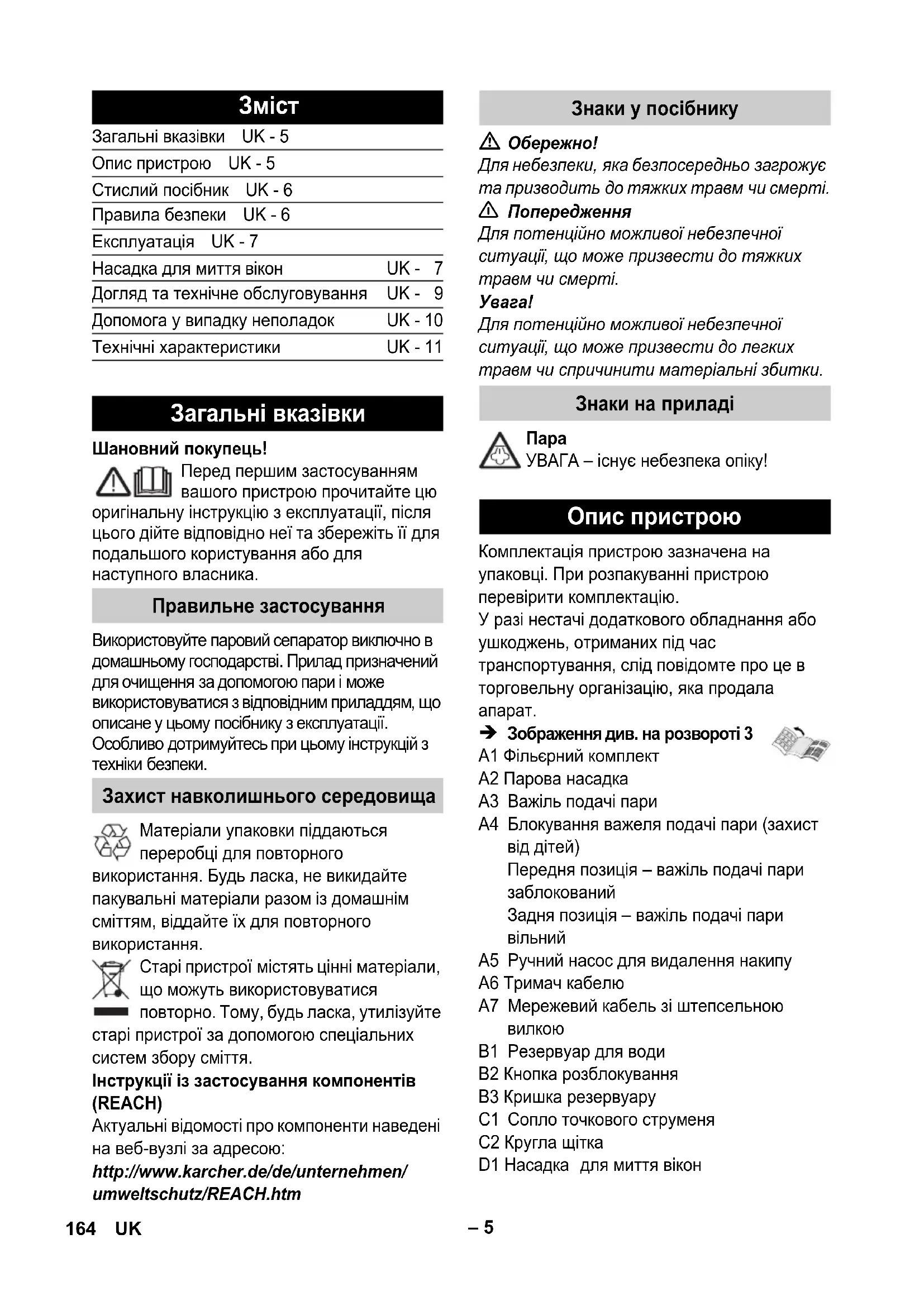 Загальні вказівки UK - 5 Опис пристрою UK - 5 Стислий посібник UK - 6 Правила безпеки UK - 6 Експлуатація UK - 7 Насадка для миття вікон UK - 7 Догляд та технічне обслуговування UK - 9 Допомога у випадку неполадок UK - 10 Технічні характеристики UK - 11 Загальні вказівки Правильне застосування Захист навколишнього середовища Знаки у посібнику Знаки на приладі Опис пристрою A1 Фільєрний комплект A2 Парова насадка A3 Важіль подачі пари A4 Блокування важеля подачі пари (захист