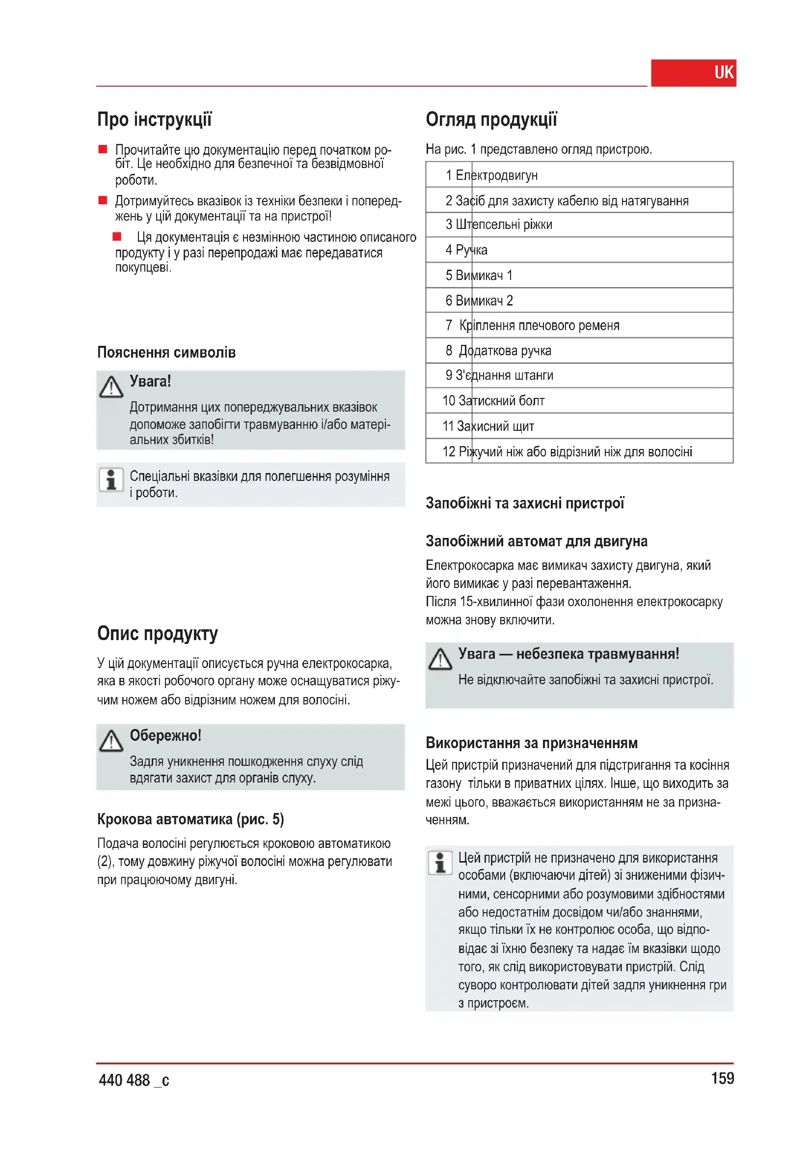 Задляуникненняпошкодженняслухуслід вдягатизахистдляорганівслуху. Крокова автоматика (рис. 5) Подачаволосінірегулюєтьсякроковоюавтоматикою (2),томудовжинуріжучоїволосініможнарегулювати припрацюючомудвигуні. Огляд продукції Нарис.1представленооглядпристрою. 1 Електродвигун 2 Засібдлязахистукабелювіднатягування 3 Штепсельніріжки 4 Ручка 5 Вимикач1 6 Вимикач2 7 Кріпленняплечовогоременя 8 Додатковаручка 9 З'єднанняштанги 10 Затискнийболт 11 Захиснийщит 12 Ріжучийніжабовідрізнийніждляволосіні Запобіжні та захисні пристрої Запобіжний автомат для двигуна Електрокосаркамаєвимикачзахистудвигуна,який йоговимикаєуразіперевантаження. Після15-хвилинноїфазиохолоненняелектрокосарку можназновувключити. Увага — небезпека травмування! Невідключайтезапобіжнітазахисніпристрої. Використання за призначенням Цейпристрійпризначенийдляпідстриганнятакосіння газонутількивприватнихцілях.Інше,щовиходитьза межіцього,вважаєтьсявикористаннямнезапризна-