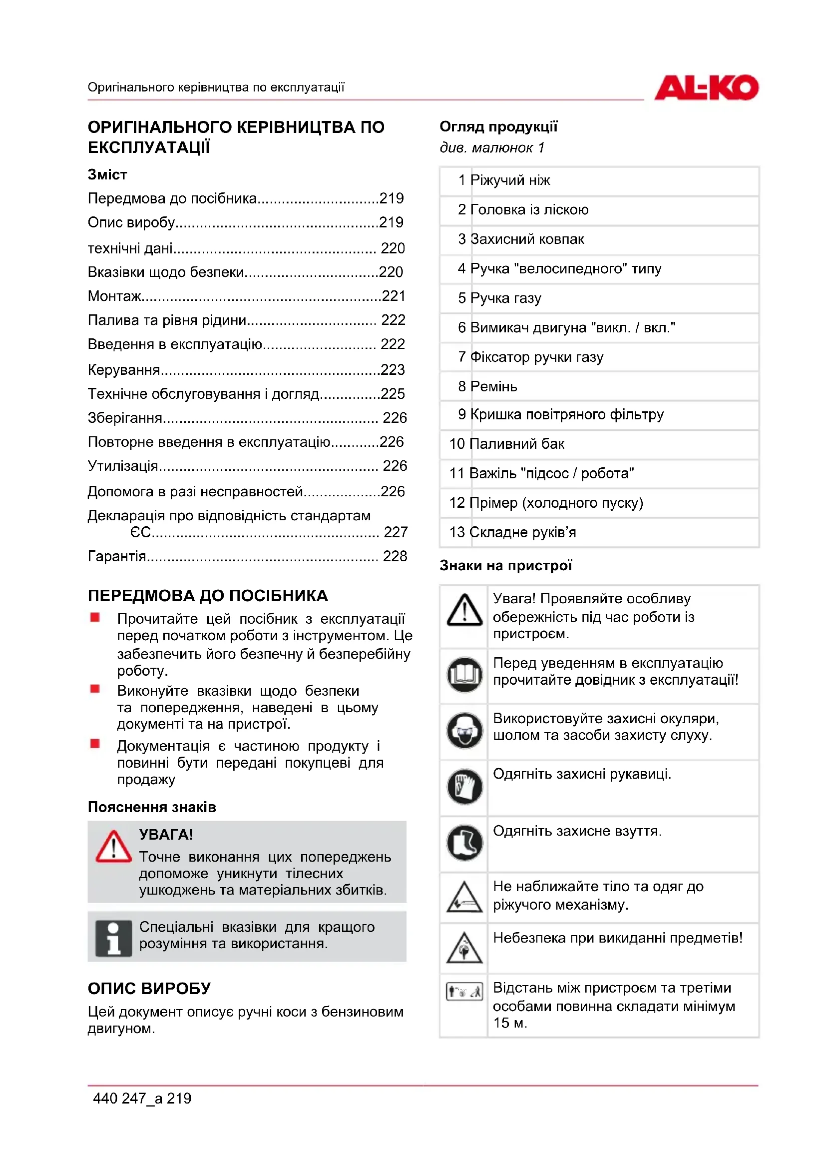 - дотримання вимог цієї інструкції з експлуатації належне поводження використання оригінальних запасних частин Гарантія втрачається при: спробах самостійного ремонту самовільному внесенні технічних змін використанні не за призначенням Гарантія не розповсюджується на: Пошкодження лакофарбового покриття, що відноситься до природного зношування Швидкозношувані деталі, які в переліку запасних частин / на кресленні позначені в рамочці [xxx xxx (x)] Двигуни внутрішнього згоряння (для них діють окремі гарантійні зобов’язання відповідних виробників двигунів) Гарантійний період починається з моменту придбання першим кінцевим споживачем. Рішення приймаються з урахуванням дати в документі, що підтверджує покупку. Будь ласка, звертайтеся з цією заявою та оригіналом документа, що підтверджує покупку, до своєї торгівельної організації або до найближчого центру обслуговування клієнтів. Ця заява не впливає на визначені законом права на претензії покупця до продавця.Πρωτότυπες οδηγίες λειτουργίας 440 247_a 229 ΠΡΩΤΌΤΥΠΕΣ ΟΔΗΓΊΕΣ ΛΕΙΤΟΥΡΓΊΑΣ Πίνακας περιεχομένων Σχετικά με το παρόν εγχειρίδιο p. 229