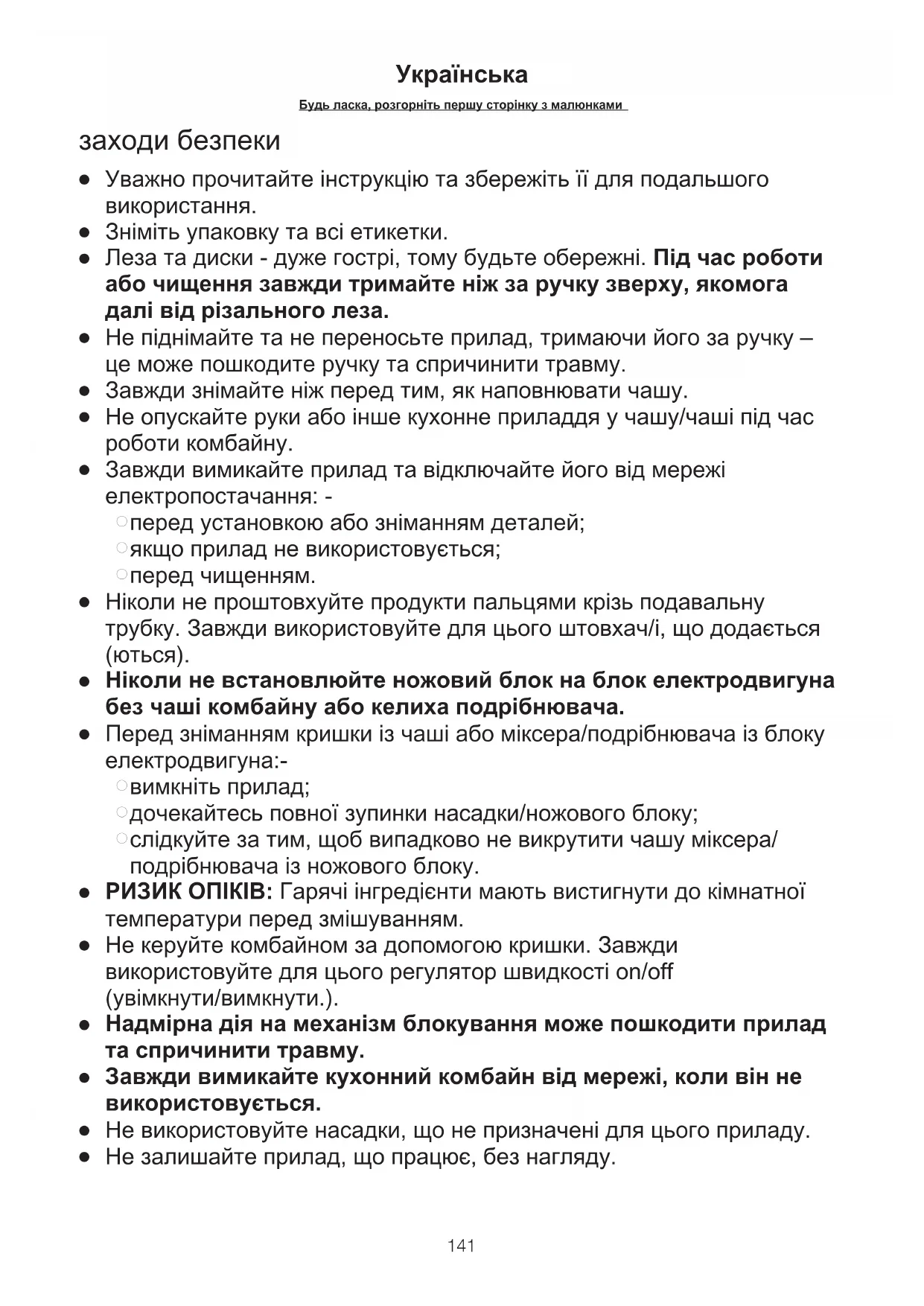 Комбайн не може використовуватися для подрібнення чи помелу кавових зерен, або для перетворення цукру на цукрову пудру.