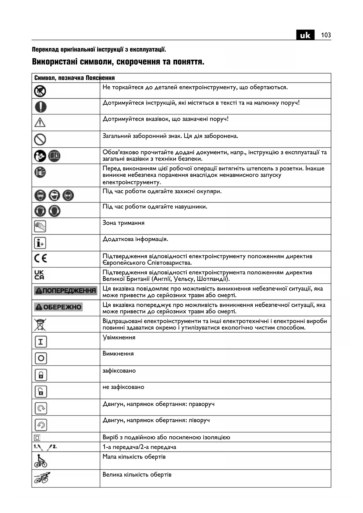 Переклад оригінальної інструкції з експлуатації. Використані символи, скорочення та поняття. Символ, позначка Пояснення Не торкайтеся до деталей електроінструменту, що обертаються. Дотримуйтеся інструкцій, які містяться в тексті та на малюнку поруч! Дотримуйтеся вказівок, що зазначені поруч! Загальний заборонний знак. Ця дія заборонена. Обов’язково прочитайте додані документи, напр., інструкцію з експлуатації та загальні вказівки з техніки безпеки. Перед виконанням цієї робочої операції витягніть штепсель з розетки. Інакше виникне небезпека поранення внаслідок ненавмисного запуску електроінструменту. Під час роботи одягайте захисні окуляри. Під час роботи одягайте навушники. Зона тримання Додаткова інформація. Підтвердження відповідності електроінструменту положенням директив