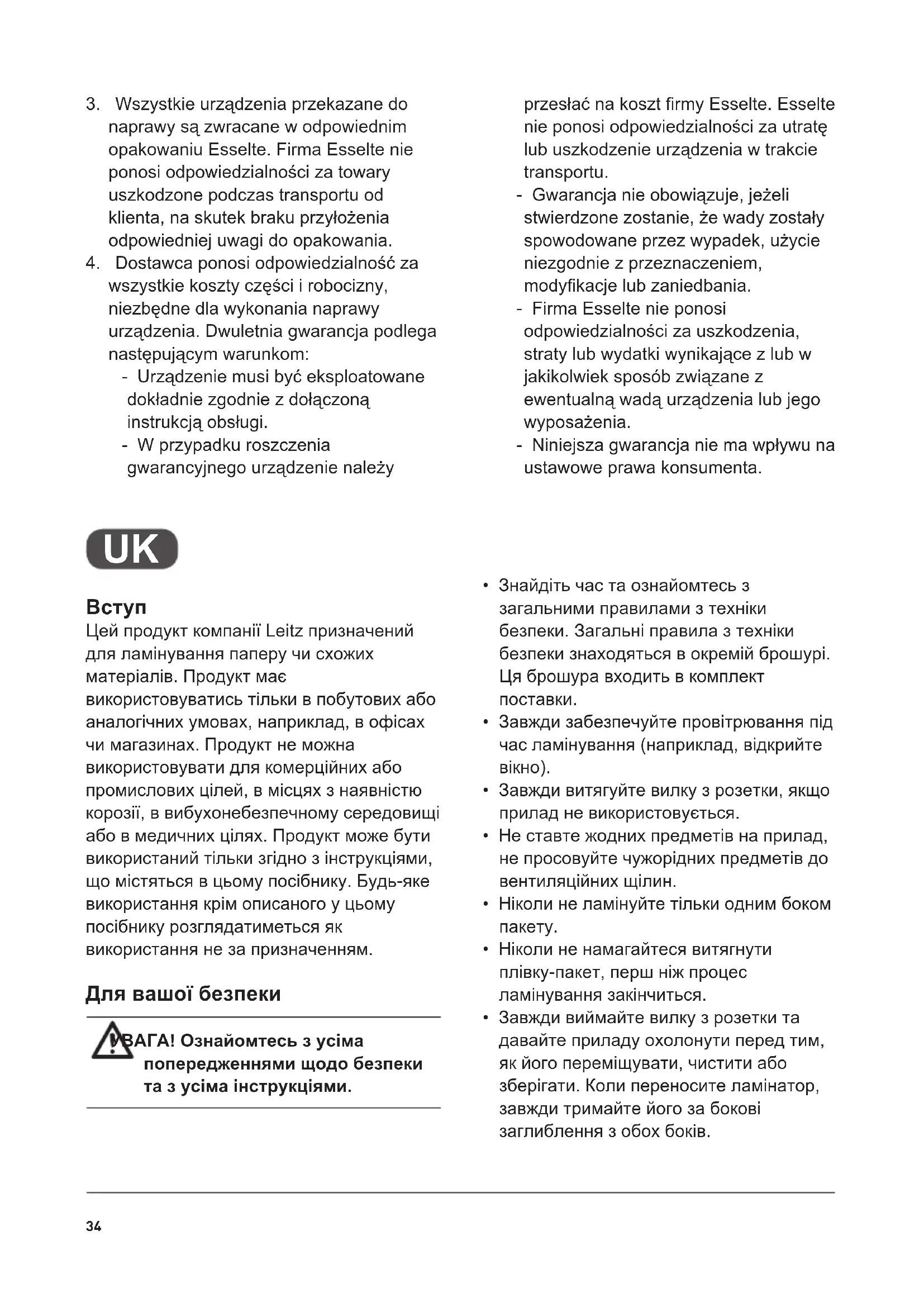 Цей продукт компанії Leitz призначений для ламінування паперу чи схожих матеріалів. Продукт має використовуватись тільки в побутових або аналогічних умовах, наприклад, в офісах чи магазинах. Продукт не можна використовувати для комерційних або промислових цілей, в місцях з наявністю корозії, в вибухонебезпечному середовищі або в медичних цілях. Продукт може бути використаний тільки згідно з інструкціями, що містяться в цьому посібнику. Будь-яке використання крім описаного у цьому посібнику розглядатиметься як використання не за призначенням. Для вашої безпеки УВАГА! Ознайомтесь з усіма попередженнями щодо безпеки та з усіма інструкціями.