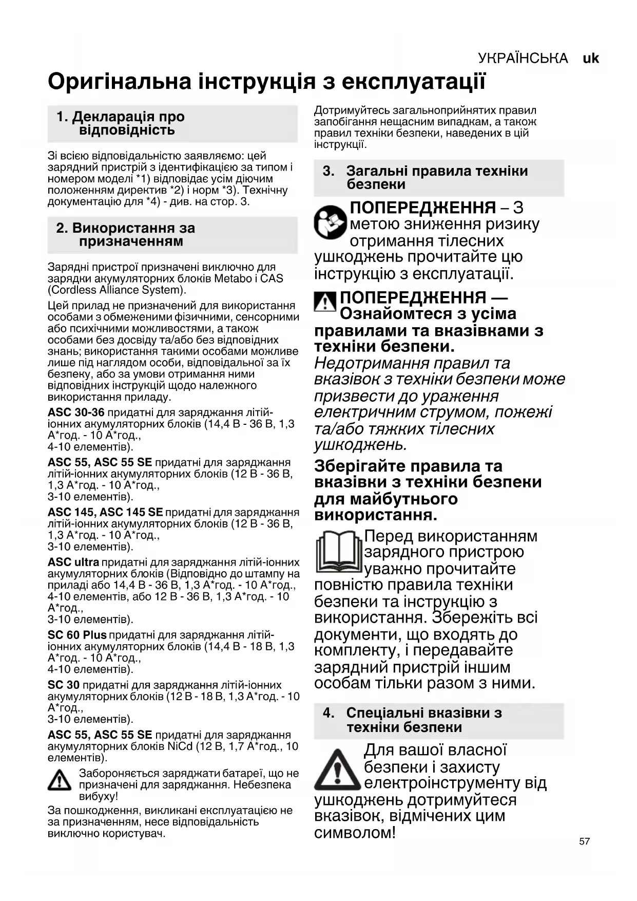 -іонних акумуляторних блоків (12 В - 36 В, 1,3 A*год. - 10 A*год., 3-10 елементів). ASC 145, ASC 145 SE придатні для заряджання літій-іонних акумуляторних блоків (12 В - 36 В, 1,3 A*год. - 10 A*год., 3-10 елементів). ASC ultra придатні для заряджання літій-іонних акумуляторних блоків (Відповідно до штампу на приладі або 14,4 В - 36 В, 1,3 A*год. - 10 A*год., 4-10 елементів, або 12 В - 36 В, 1,3 A*год. - 10 A*год., 3-10 елементів). SC 60 Plus придатні для заряджання літій- іонних акумуляторних блоків (14,4 В - 18 В, 1,3 A*год. - 10 A*год., 4-10 елементів). SC 30 придатні для заряджання літій-іонних акумуляторних блоків (12 В - 18 В, 1,3 A*год. - 10 A*год., 3-10 елементів). ASC 55, ASC 55 SE придатні для заряджання акумуляторних блоків NiCd (12 В, 1,7 A*год., 10 елементів). Забороняється заряджати батареї, що не призначені для заряджання. Небезпека