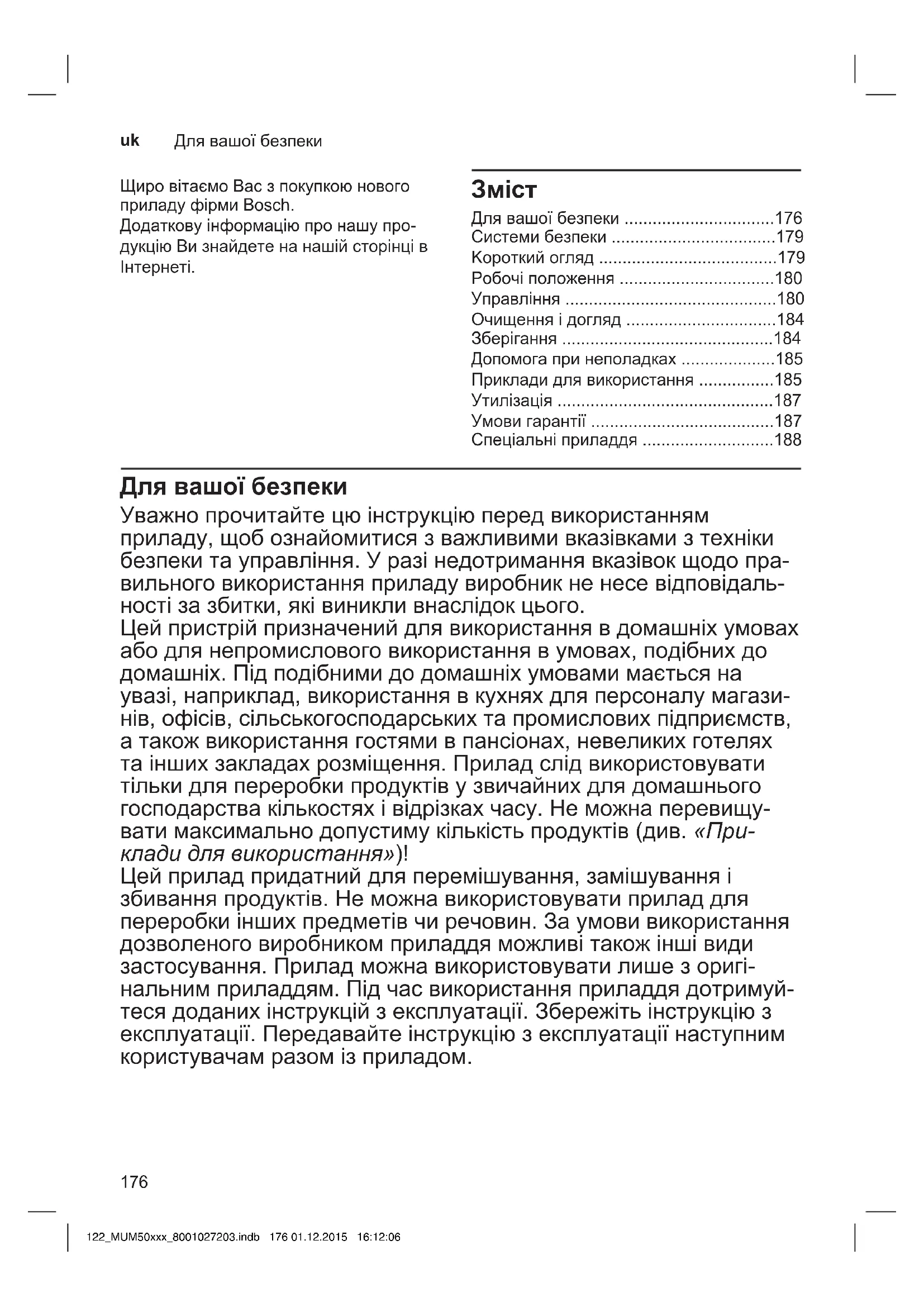 - Спеціальніприладдя Для вашої безпеки Уважнопрочитайтецюінструкціюпередвикористанням приладу,щобознайомитисязважливимивказівкамизтехніки безпекитауправління.Уразінедотриманнявказівокщодопра- вильноговикористанняприладувиробникненесевідповідаль- ностізазбитки,яківиникливнаслідокцього. Цейпристрійпризначенийдлявикористаннявдомашніхумовах абодлянепромисловоговикористаннявумовах,подібнихдо домашніх.Підподібнимидодомашніхумовамимаєтьсяна увазі,наприклад,використаннявкухняхдляперсоналумагази- нів,офісів,сільськогосподарськихтапромисловихпідприємств, атакожвикористаннягостямивпансіонах,невеликихготелях таіншихзакладахрозміщення.Приладслідвикористовувати тількидляпереробкипродуктівузвичайнихдлядомашнього господарствакількостяхівідрізкахчасу.Неможнаперевищу- ватимаксимальнодопустимукількістьпродуктів(див.«При- кладидлявикористання»)! Цейприладпридатнийдляперемішування,замішуванняі збиванняпродуктів.Неможнавикористовуватиприладдля переробкиіншихпредметівчиречовин.Заумовивикористання дозволеноговиробникомприладдяможливітакожіншівиди застосування.Приладможнавикористовуватилишезоригі- нальнимприладдям.Підчасвикористанняприладдядотримуй- тесядоданихінструкційзексплуатації.Збережітьінструкціюз експлуатації.Передавайтеінструкціюзексплуатаціїнаступним користувачамразомізприладом. 122_MUM50xxx_8001027203.indb 176 01.12.2015 16:12:06 177 p. 188