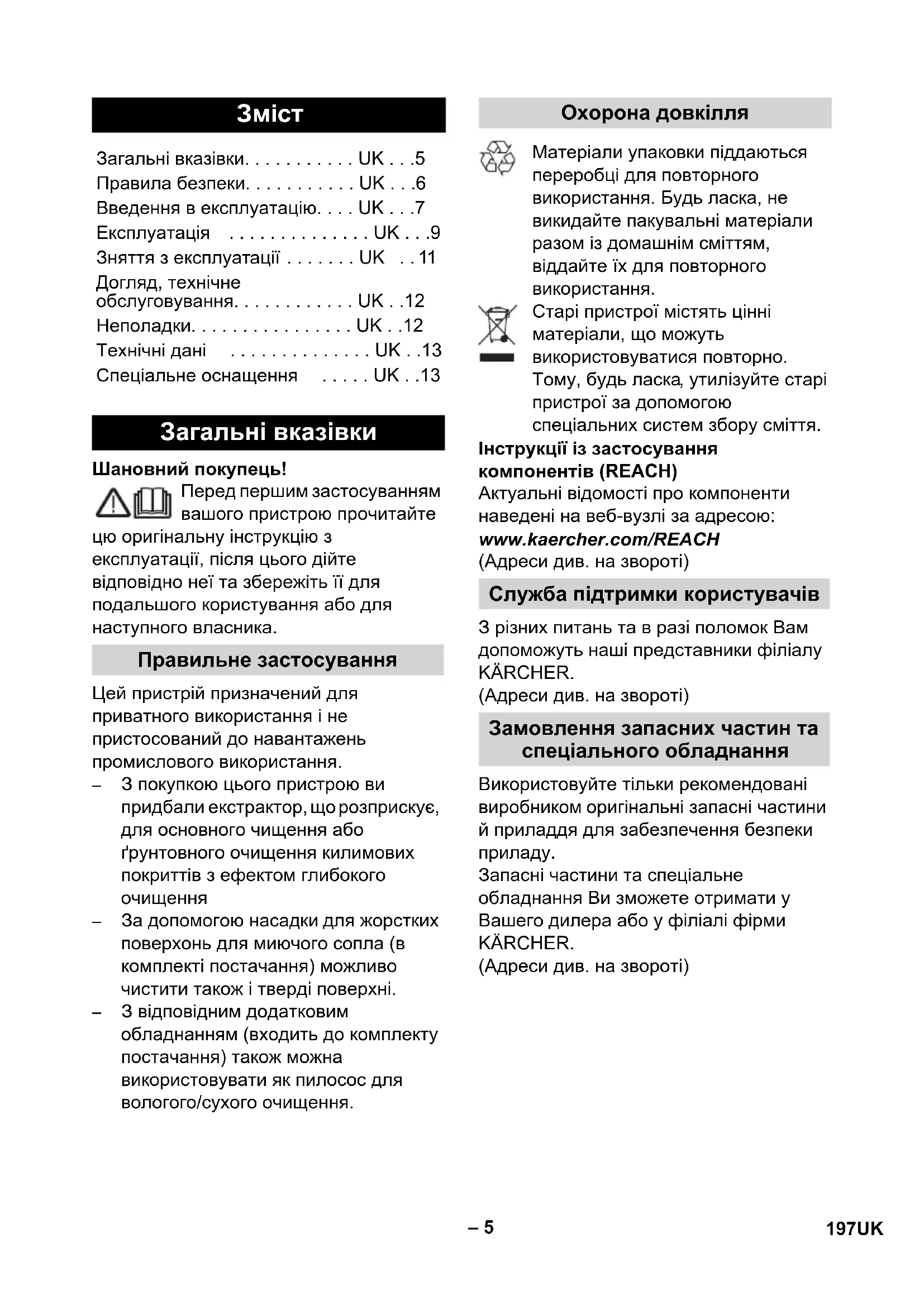 – За допомогою насадки для жорстких поверхонь для миючого сопла (в комплекті постачання) можливо чистити також і тверді поверхні. – З відповідним додатковим обладнанням (входить до комплекту постачання) також можна використовувати як пилосос для вологого/сухого очищення. Матеріали упаковки піддаються переробці для повторного використання. Будь ласка, не викидайте пакувальні матеріали разом із домашнім сміттям, віддайте їх для повторного використання. Старі пристрої містять цінні матеріали, що можуть використовуватися повторно. Тому, будь ласка , утилізуйте старі пристрої за допомогою спеціальних систем збору сміття. Інструкції із застосування компонентів (REACH) Актуальні відомості про компоненти наведені на веб-вузлі за адресою: www.kaercher.com/REACH (Адреси див. на звороті) З різних питань та в разі поломок Вам допоможуть наші представники філіалу KÄRCHER. (Адреси див. на звороті) Використовуйте тільки рекомендовані виробником оригінальні запасні