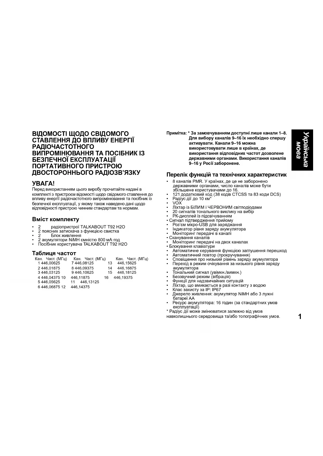 - Посібник користувача TALKABOUT T92 H2O Таблиця частот Примітка: * За замовчуванням доступні лише канали 1–8. Для вибору каналів 9–16 їх необхідно спершу активувати. Канали 9–16 можна використовувати лише в країнах, де використання відповідних частот дозволене державними органами. Використання каналів 9–16 у Росії заборонене. Перелік функцій та технічних характеристик