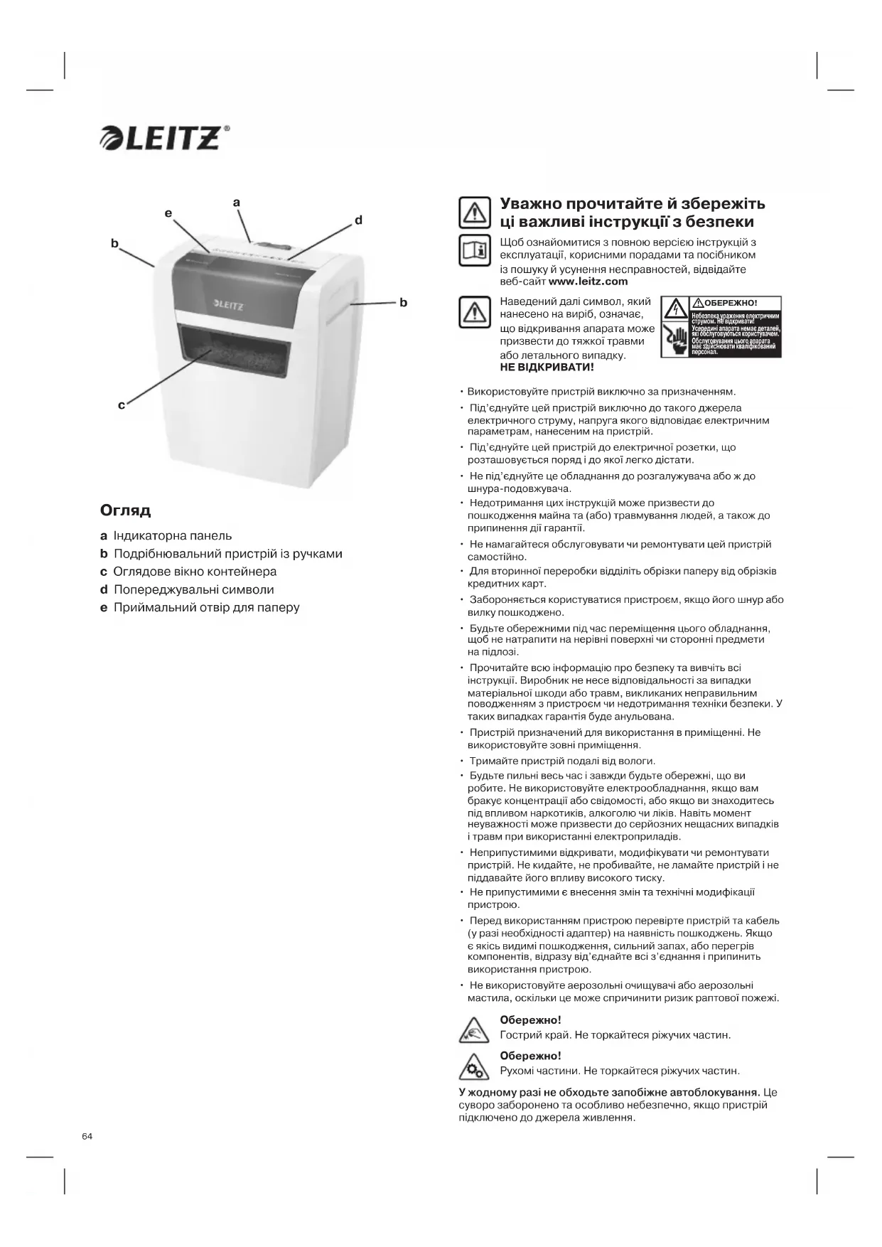 Уважно прочитайте й збережіть ці важливі інструкції з безпеки Щоб ознайомитися з повною версією інструкцій з експлуатації, корисними порадами та посібником із пошуку й усунення несправностей, відвідайте веб-сайт www.leitz.com