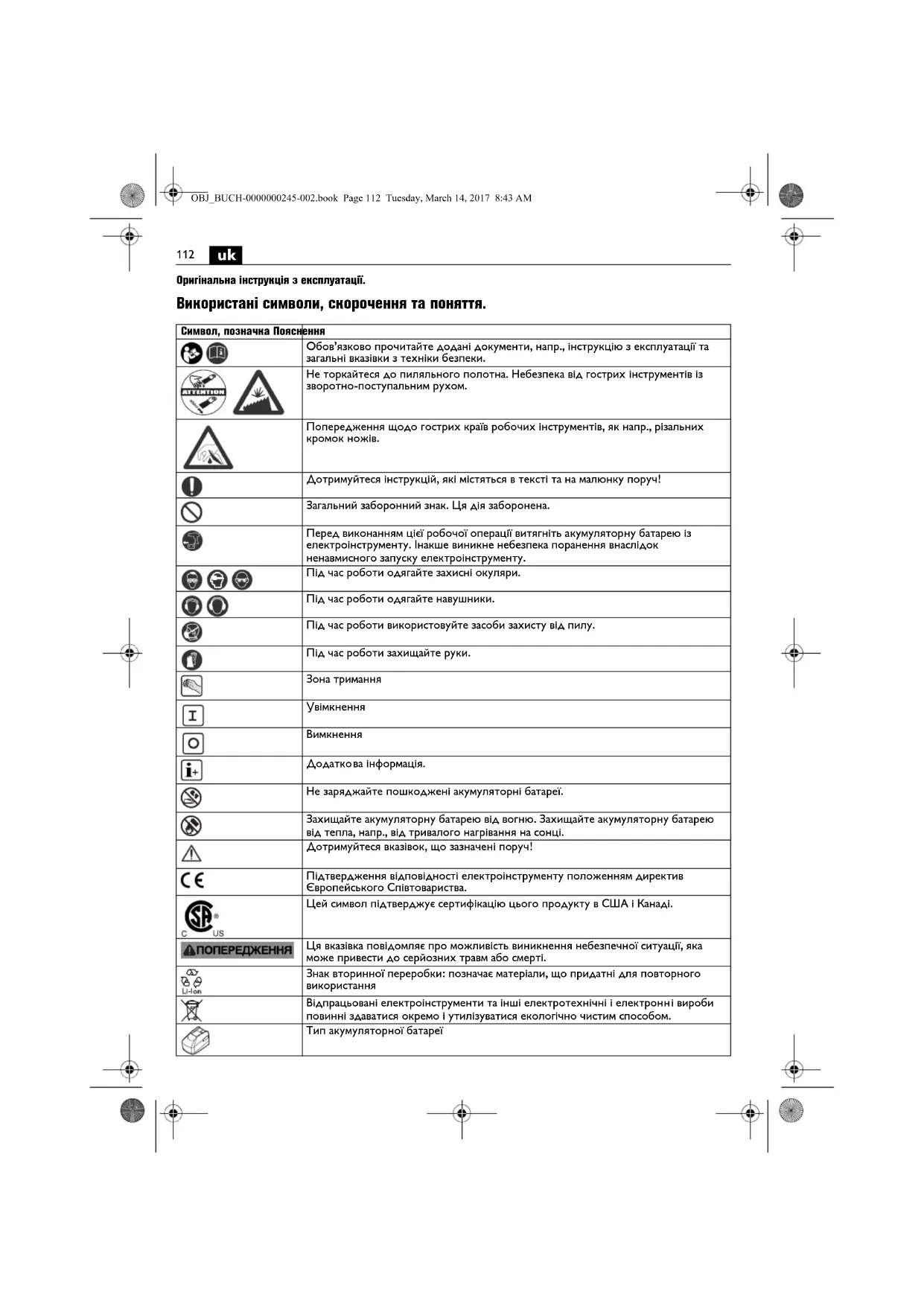 Оригінальна інструкція з експлуатації. Використані символи, скорочення та поняття. Символ, позначка Пояснення Обов’язково прочитайте додані документи, напр., інструкцію з експлуатації та загальні вказівки з техніки безпеки. Не торкайтеся до пиляльного полотна. Небезпека від гострих інструментів із зворотно-поступальним рухом. Попередження щодо гострих країв робочих інструментів, як напр., різальних кромок ножів. Дотримуйтеся інструкцій, які містяться в тексті та на малюнку поруч! Загальний заборонний знак. Ця дія заборонена. Перед виконанням цієї робочої операції витягніть акумуляторну батарею із електроінструменту. Інакше виникне небезпека поранення внаслідок ненавмисного запуску електроінструменту. Під час роботи одягайте захисні окуляри. Під час роботи одягайте навушники. Під час роботи використовуйте засоби захисту від пилу. Під час роботи захищайте руки. Зона тримання