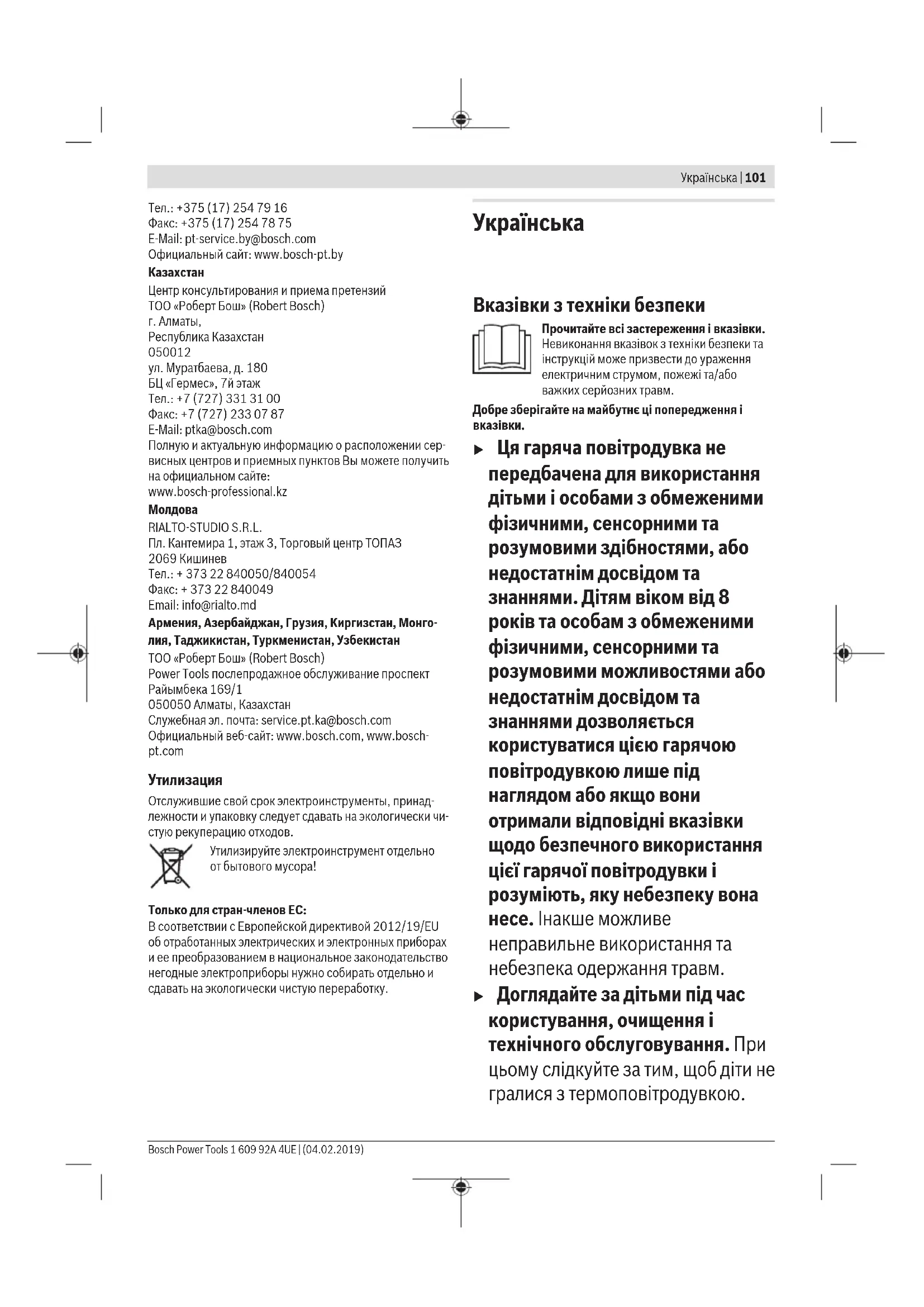 u Ця гаряча повітродувка не передбачена для використання дітьми і особами з обмеженими фізичними, сенсорними та розумовими здібностями, або недостатнім досвідом та знаннями. Дітям віком від 8 років та особам з обмеженими фізичними, сенсорними та розумовими можливостями або недостатнім досвідом та знаннями дозволяється користуватися цією гарячою повітродувкою лише під наглядом або якщо вони отримали відповідні вказівки щодо безпечного використання цієї гарячої повітродувки і розуміють, яку небезпеку вона несе. Інакше можливе неправильне використання та небезпека одержання травм. u Доглядайте за дітьми під час користування, очищення і технічного обслуговування. При цьому слідкуйте за тим, щоб діти не гралися з термоповітродувкою. Bosch Power Tools 1 609 92A 4UE | (04.02.2019)102 | Українська u Обережно поводьтеся з електроінструментом. Цей електроінструмент сильно нагрівається, що призводить до підвищеної небезпеки пожежі і