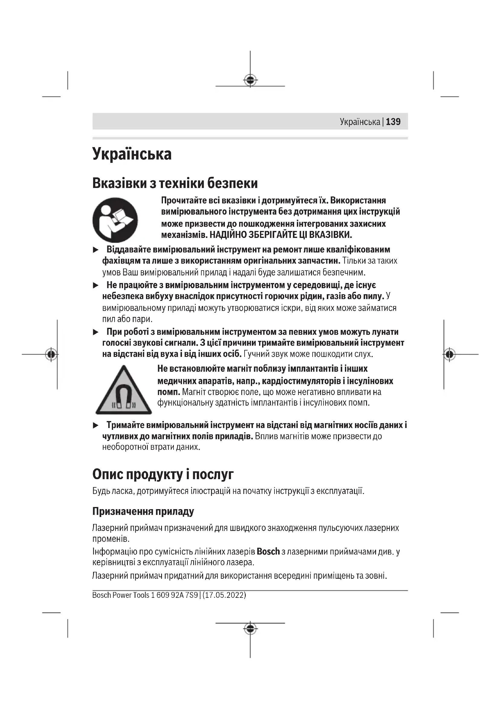 Вказівки з техніки безпеки Прочитайте всі вказівки і дотримуйтеся їх. Використання вимірювального інструмента без дотримання цих інструкцій може призвести до пошкодження інтегрованих захисних механізмів. НАДІЙНО ЗБЕРІГАЙТЕ ЦІ ВКАЗІВКИ. u Віддавайте вимірювальний інструмент на ремонт лише кваліфікованим фахівцям та лише з використанням оригінальних запчастин. Тільки за таких умов Ваш вимірювальний прилад і надалі буде залишатися безпечним. u Не працюйте з вимірювальним інструментом у середовищі, де існує небезпека вибуху внаслідок присутності горючих рідин, газів або пилу. У вимірювальному приладі можуть утворюватися іскри, від яких може займатися пил або пари. u При роботі з вимірювальним інструментом за певних умов можуть лунати голосні звукові сигнали. З цієї причини тримайте вимірювальний інструмент на відстані від вуха і від інших осіб. Гучний звук може пошкодити слух. Не встановлюйте магніт поблизу імплантантів і інших медичних апаратів, напр., кардіостимуляторів і інсулінових помп. Магніт створює поле, що може негативно впливати на функціональну здатність імплантантів і інсулінових помп. u Тримайте вимірювальний інструмент на відстані від магнітних носіїв даних і чутливих до магнітних полів приладів. Вплив магнітів може призвести до необоротної втрати даних. Опис продукту і послуг Будь ласка, дотримуйтеся ілюстрацій на початку інструкції з експлуатації. Призначення приладу Лазерний приймач призначений для швидкого знаходження пульсуючих лазерних