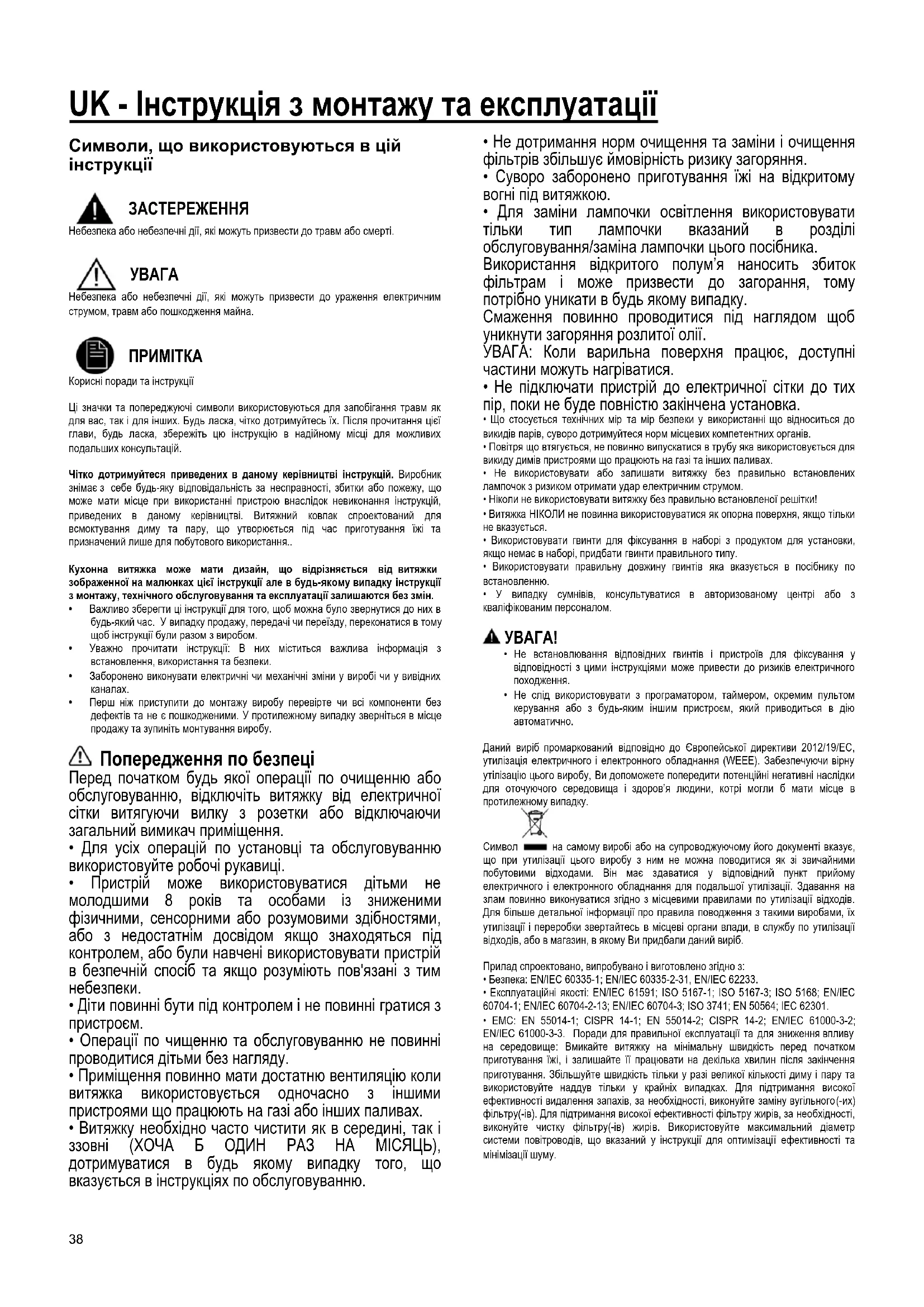 - EMC: EN 55014-1; CISPR 14-1; EN 55014-2; CISPR 14-2; EN/IEC 61000-3-2; EN/IEC 61000-3-3. Поради для правильної експлуатації та для зниження впливу на середовище: Вмикайте витяжку на мінімальну швидкість перед початком приготування їжі, і залишайте її працювати на декілька хвилин після закінчення приготування. Збільшуйте швидкість тільки у разі великої кількості диму і пару та використовуйте наддув тільки у крайніх випадках. Для підтримання високої ефективності видалення запахів, за необхідності, виконуйте заміну вугільного