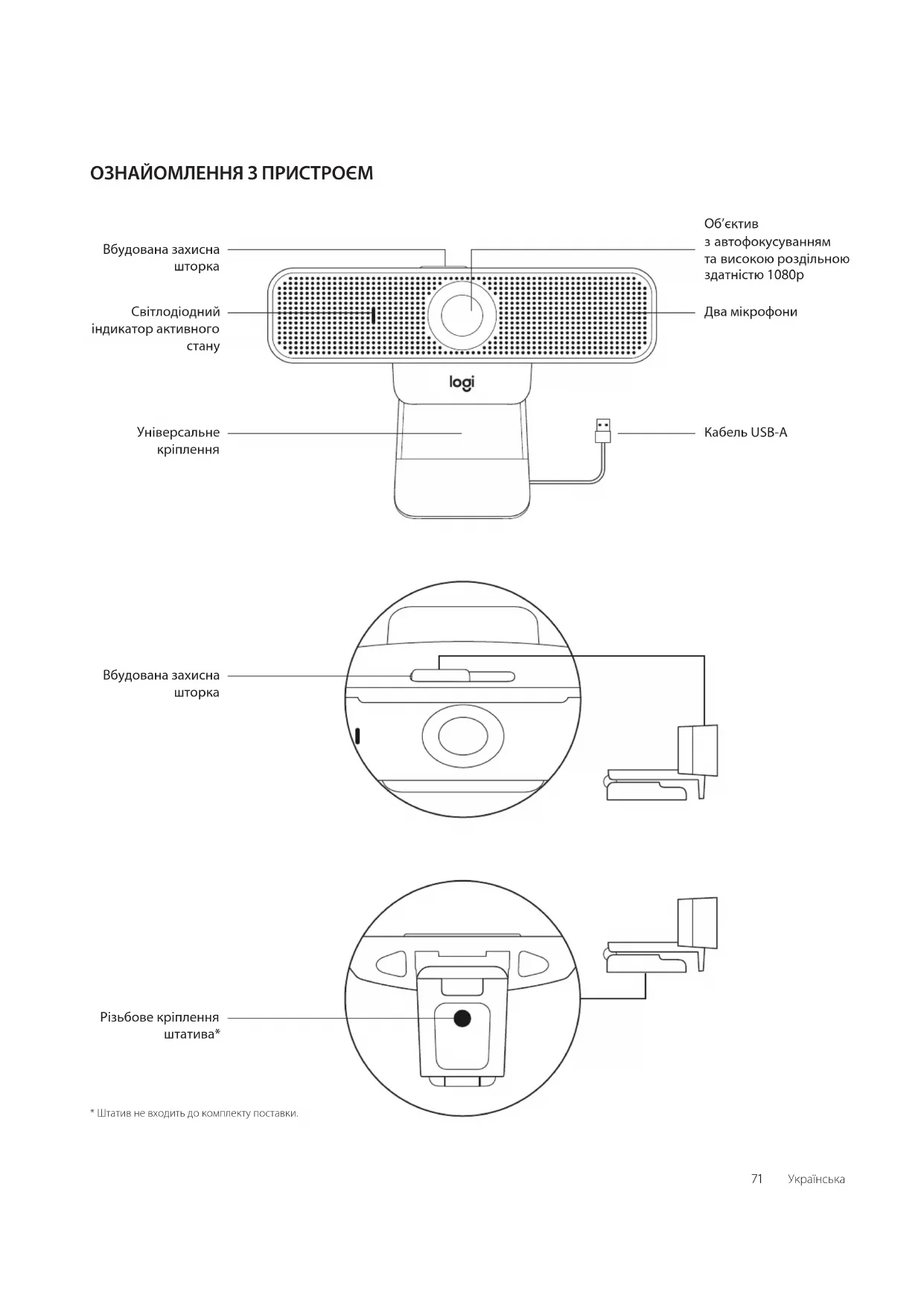 завтофокусуванням тависокою роздільною здатністю1080p Кабель USB-A *Штатив не входить до комплекту поставки. 71 УкраїнськаUSB-A У КОМПЛЕКТІ 1 Вебкамера з прикріпленим кабелем USB-A (1,83м) 2 Документація користувача КЕРУВАННЯ ВБУДОВАНОЮ ЗАХИСНОЮ ШТОРКОЮ 1 Вебкамера C925e має вбудовану захисну шторку. Повзунок, за допомогою якого можна відкрити або закрити шторку, розташовано на верхній частині вебкамери безпосередньо над об’єктивом. 2 Щоб відчинити захисну шторку, перемістіть повзунокліворуч. 3 Щоб зачинити захисну шторку та прикрити об’єктив, перемістіть повзунок праворуч. Коли шторку зачинено, об’єктив видається білим. 72 Українська*Штатив не входить до комплекту поставки. ПІДГОТОВКА ВЕБКАМЕРИ ДО РОБОТИ Для розташування на моніторі 1 Установіть вебкамеру на комп’ютер, ноутбук або монітор употрібному положенні та під потрібним кутом. 2 Відрегулюйте положення вебкамери так, щоб підставка універсального кріплення повністю прилягала до задньої панелі пристрою. 3 Відрегулюйте вручну кут нахилу вебкамери, щобзабезпечити оптимальне кадрування. Розташування на штативі* 1 Встановіть різьбове кріплення штатива ¼ дюйма у нижній частині універсального кріплення. 2 Закріпіть вебкамеру на штативі за допомогою різьблення¼ дюйма. 3 Розташуйте вебкамеру на штативі в будь-якому місці, девам буде зручно. 73 УкраїнськаЗІСТАЦІОНАРНИМ КРІПЛЕННЯМ Висотаxширинаxдовжина: 73ммx126ммx45мм Довжина кабелю: 1,83м Вага: 170г