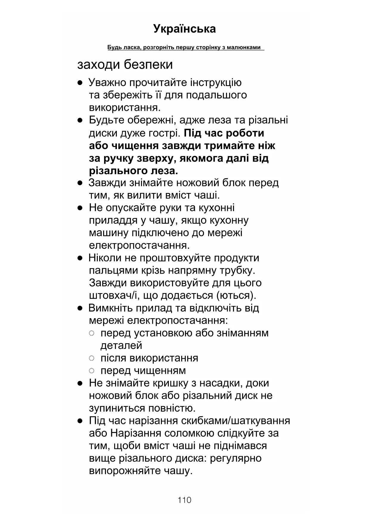Будьте обережні, адже леза та різальні диски дуже гострі. Під час роботи або чищення завжди тримайте ніж за ручку зверху, якомога далі від різального леза.