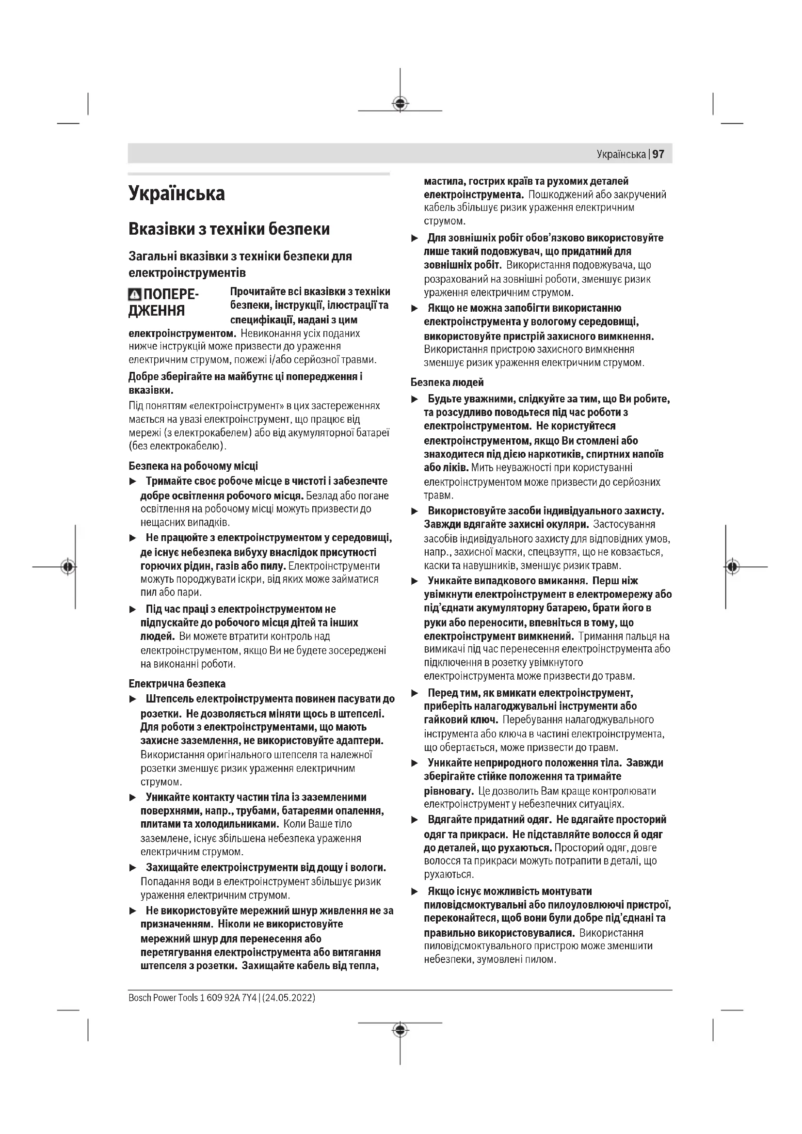 u Якщо існує можливість монтувати пиловідсмоктувальні або пилоуловлюючі пристрої, переконайтеся, щоб вони були добре під’єднані та правильно використовувалися. Використання пиловідсмоктувального пристрою може зменшити небезпеки, зумовлені пилом. Bosch Power Tools 1 609 92A 7Y4 | (24.05.2022)98 | Українська u Добре знання електроінструментів, отримане в результаті частого їх використання, не повинно призводити до самовпевненості й ігнорування принципів техніки безпеки. Необережна дія може в одну мить призвести до важкої травми. Правильне поводження та користування електроінструментами u Не перевантажуйте електроінструмент. Використовуйте такий електроінструмент, що спеціально призначений для відповідної роботи. Зпридатним електроінструментом Ви з меншим ризиком отримаєте кращі результати роботи, якщо будете працювати в зазначеному діапазоні потужності. u Не користуйтеся електроінструментом з пошкодженим вимикачем. Електроінструмент, який не вмикається або не вимикається, є небезпечним і його треба відремонтувати. u Перед тим, як регулювати що-небудь в електроінструменті, міняти приладдя або ховати електроінструмент, витягніть штепсель із розетки та/або витягніть акумуляторну батарею. Ці попереджувальні заходи з техніки безпеки зменшують ризик випадкового запуску електроінструмента. u Ховайте електроінструменти, якими Ви саме не користуєтеся, від дітей. Не дозволяйте користуватися електроінструментом особам, що не знайомі з його роботою або не читали ці вказівки. Використання електроінструментів недосвідченими особами може бути небезпечним. u Старанно доглядайте за електроінструментами і приладдям. Перевіряйте, щоб рухомі деталі електроінструмента були правильно розташовані та не заїдали, не були пошкодженими або у будь- якому іншому стані, який міг би вплинути на функціонування електроінструмента. Пошкоджені електроінструменти потрібно відремонтувати, перш ніж користуватися ними знову. Велика кількість нещасних випадків спричиняється поганим доглядом за електроінструментами. u Тримайте різальні інструменти нагостреними та в чистоті. Старанно доглянуті різальні інструменти з гострим різальним краєм менше застряють та легші в експлуатації. u Використовуйте електроінструмент, приладдя до нього, робочі інструменти тощо відповідно до цих вказівок. Беріть до уваги при цьому умови роботи та специфіку виконуваної роботи. Використання електроінструментів для робіт, для яких вони не передбачені, може призвести до небезпечних