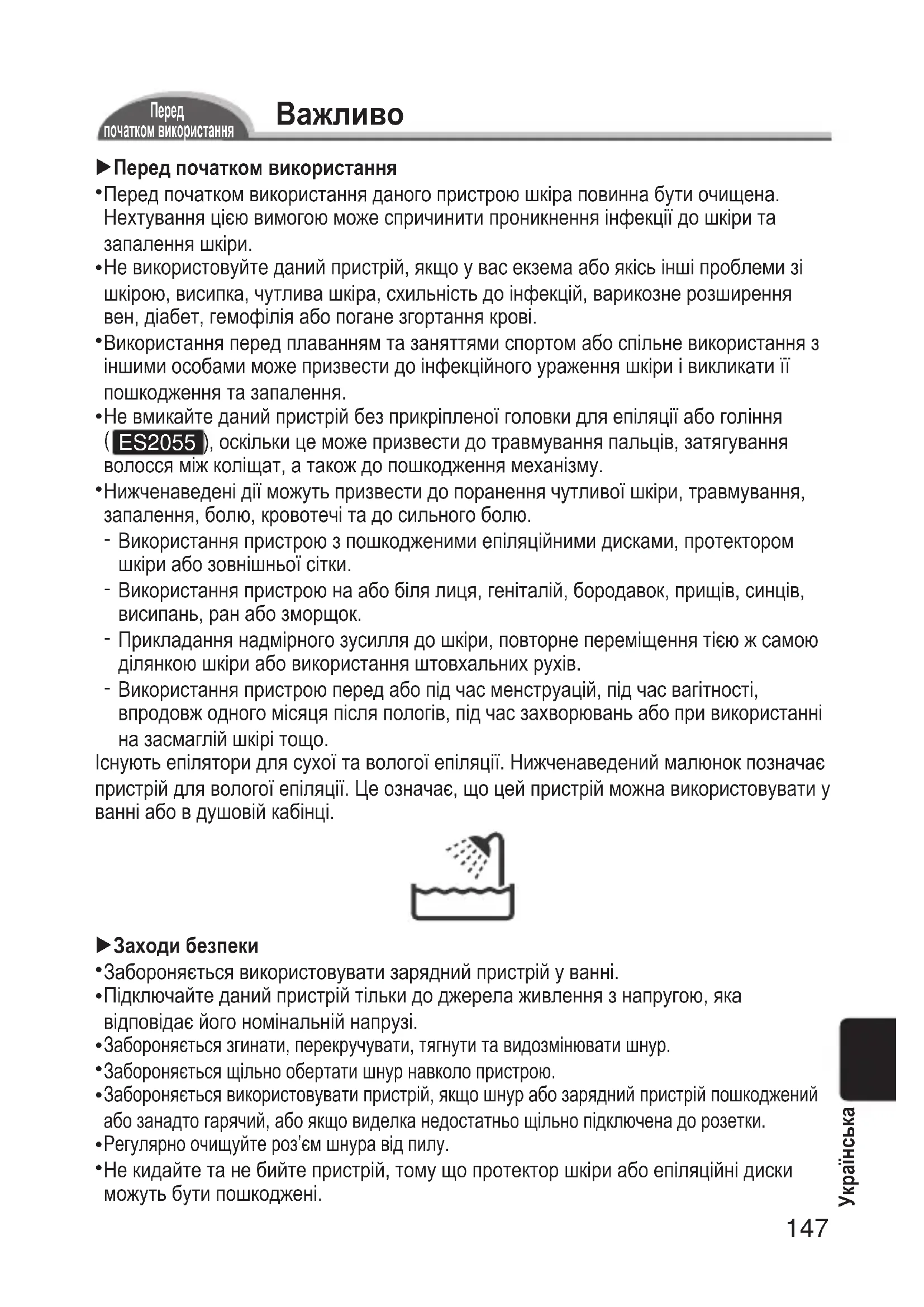 ES2055 ), оскільки це може призвести до травмування пальців, затягування волосся між коліщат, а також до пошкодження механізму. Нижченаведені дії можуть призвести до поранення чутливої шкіри, травмування, запалення, болю, кровотечі та до сильного болю. Використання пристрою з пошкодженими епіляційними дисками, протектором шкіри або зовнішньої сітки. Використання пристрою на або біля лиця, геніталій, бородавок, прищів, синців, висипань, ран або зморщок. Прикладання надмірного зусилля до шкіри, повторне переміщення тією ж самою ділянкою шкіри або використання штовхальних рухів. Використання пристрою перед або під час менструацій, під час вагітності, впродовж одного місяця після пологів, під час захворювань або при використанні на засмаглій шкірі тощо. Існують епілятори для сухої та вологої епіляції. Нижченаведений малюнок позначає пристрій для вологої епіляції. Це означає, що цей пристрій можна використовувати у ванні або в душовій кабінці. 1Заходибезпеки Забороняється використовувати зарядний пристрій у ванні. Підключайте даний пристрій тільки до джерела живлення з напругою, яка відповідає його номінальній напрузі. Забороняється згинати, перекручувати, тягнути та видозмінювати шнур. Забороняється щільно обертати шнур навколо пристрою. Забороняється використовувати пристрій, якщо шнур або зарядний пристрій пошкоджений або занадто гарячий, або якщо виделка недостатньо щільно підключена до розетки. Регулярно очищуйте роз’єм шнура від пилу. Не кидайте та не бийте пристрій, тому що протектор шкіри або епіляційні диски можуть бути пошкоджені.
