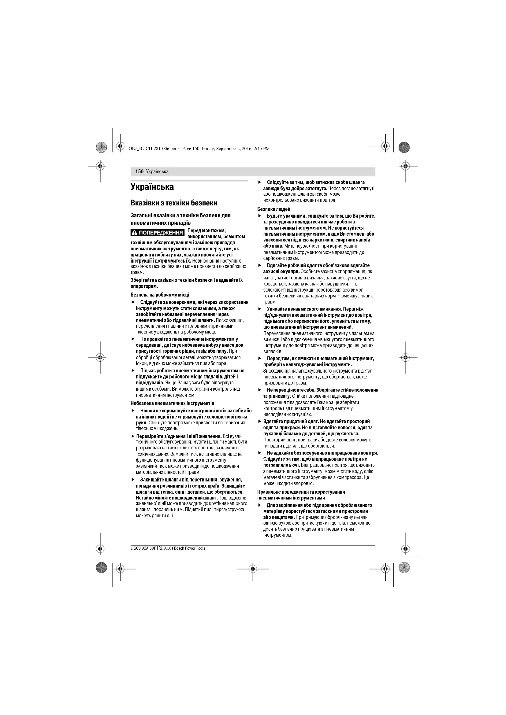 OBJ_BUCH-281-006.book Page 151 Friday, September 2, 2016 2:45 PM152 | Українська 1 609 92A 39P | (2.9.16) Bosch Power Tools Оператору не можна ігнорувати такі симптоми, як напр., тривале нездужання, поява скарг, часте серцебиття, болі, свербіж, глухота, печіння або заніміння. Оператор повинен повідомити про це роботодавцю і звернутись за кваліфікованою медичною консультацією. Не торкайтеся до патронів і приладдя під час ударної дії, оскільки це може збільшити небезпеку порізів, опіків і травм внаслідок вібрації. Використовуйте лише патрони в доброму робочому стані. Поганий стан патронів і приладдя може призводити до іх ламання і розлітання під час роботи з ударним шуруповертом. Для знаходження труб і проводки використовуйте придатні прилади або зверніться в місцеве підприємство електро-, газо- та водопостачання. Зачеплення електропроводки може призводити до пожежі та ураження електричним струмом. Зачеплення газової труби може призводити до вибуху. Зачеплення водопровідної труби може завдати шкоду матеріальним цінностям. Уникайте контакту з проводкою, що знаходиться під напругою. Пневмоінструмент не має ізоляції, і контакт з проводкою, що зна ходиться під напругою, може призвести до ураження електричним струмом. Пил, що утворюється при обробці наждаком, розпилюванні, шліфуванні, свердленні і подібних роботах, може бути канцерогенним, шкідливим для плода або змінювати спадковий матеріал. Зокрема, пил може містити: –свинець у фарбах і лаках; –кристалічний кремнезем в цеглі, цементі та інших матеріалах, що застосовуються при муруванні стін; –арсен і хромат в деревині, що була оброблена хімікатами. Ризик захворювання залежить від того, як часто Ви зазнавали дію цих речовин. Для зменшення небезпеки треба працювати в добре провітрю ваних приміщеннях і вдягати відповідне захисне спорядження (напр., спеціальний респіратор, що відфільтровує навіть щонайменші пилини). Вдягайте навушники. Шум може пошкодити слух. При роботі із заготовкою можуть виникнути додаткові шуми, яких можна запобігти за допомогою відповідних заходів, напр., використання ізоляційних матеріалів при дзеленчанні при контакті із заготовкою. Якщо пневматичний інструмент оснащений шумоглушником, завжди перевіряйте його наявність на своєму місці і добрий робочий стан. Вібрація може завдати шкоди нервам і кровообігу кистей і рук. Якщо шкіра на пальцях або кистях німіє, свербить, болить або біліє, припиніть роботу з пневматичним інструментом, повідомте про це роботодавцю і зверніться до лікаря. Не використовуйте зношені або непридатні патрони та подовжувачі. Це може призвести до посилення