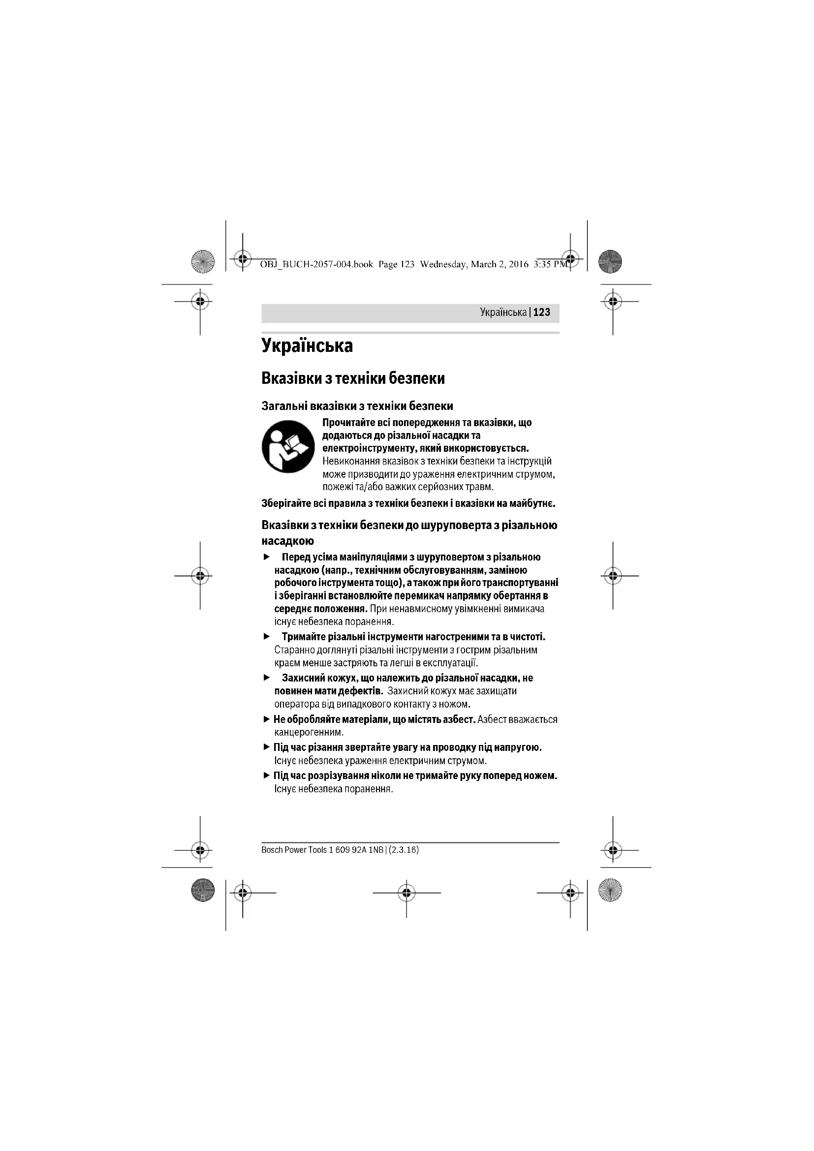 Перед усіма маніпуляціями з шуруповертом з різальною насадкою (напр., технічним обслуговуванням, заміною робочого інструмента тощо), а також при його транспортуванні і зберіганні встановлюйте перемикач напрямку обертання в Різальна насадка Cutter Товарний номер 1 600 A00 1YN Вага відповідно до EPTA- Procedure 01:2014 кг 0,15 Henk Becker Executive Vice President Engineering Helmut Heinzelmann Head of Product Certification PT/ETM9 OBJ_BUCH-2057-004.book Page 125 Wednesday, March 2, 2016 3:35 PM126 | Українська 1 609 92A 1NB | (2.3.16) Bosch Power Tools середнє положення. При ненавмисному увімкненні вимикача існує небезпека поранення. Встановлення різальної насадки (див. мал. A1 –A2) – Перед монтажом різальної насадки 1 гумовий ковпачок 9 шуруповерта треба зняти, потягнувши його уперед. –Після цього встановіть різальну насадку на шуруповерт. Різальна насадка повинна відчутно увійти у зачеплення. Вказівка: Різальну насадку можна встановлювати у 8 різних положеннях. Цим забезпечується оптимальне робоче положення, напр., для відрізання підлогового покриття уздовж стіни. Демонтаж (див. малюнки B1–B2) –Поверніть кільце розблокування 4 у напрямку і зніміть різальну насадку, потягнувши її уперед (). –Після цього надіньте гумовий ковпачок 9 знову на шуруповерт. Зміна ножа (див. малюнки C1–C2) Вказівка: Міняйте ніж, лише коли різальна насадка встановлена на шуруповерт. Це блокує шпиндель робочого інструмента, і гвинт для закріплення ножа можна відпустити. – Встановіть перемикач напрямку обертання 5 у середнє
