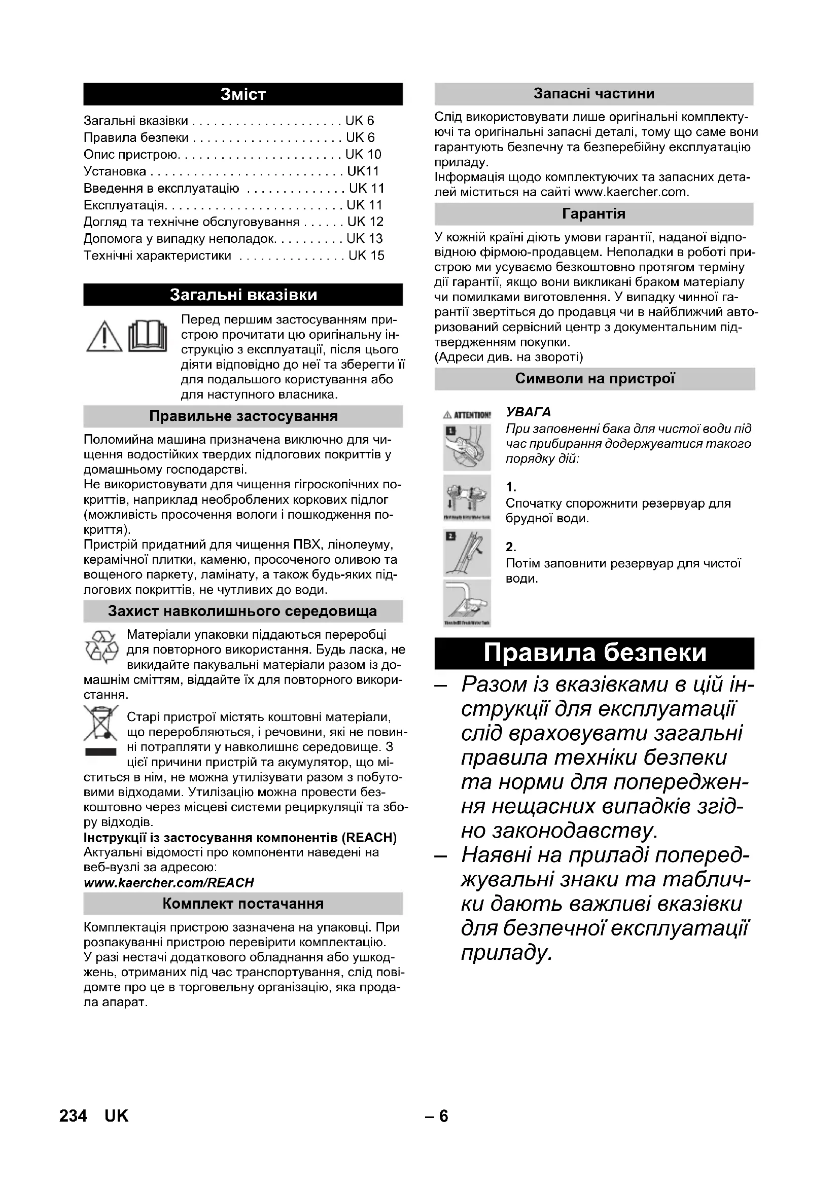 Інформація щодо комплектуючих та запасних дета- лей міститься на сайті www.kaercher.com. У кожній країні діють умови гарантії, наданої відпо- відною фірмою-продавцем. Неполадки в роботі при- строю ми усуваємо безкоштовно протягом терміну дії гарантії, якщо вони викликані браком матеріалу чи помилками виготовлення. У випадку чинної га- рантії звертіться до продавця чи в найближчий авто- ризований сервісний центр з документальним під- твердженням покупки. (Адреси див. на звороті) – Разом із вказівками в цій ін- струкції для експлуатації слід враховувати загальні правила техніки безпеки та норми для попереджен- ня нещасних випадків згід- но законодавству. – Наявні на приладі поперед- жувальні знаки та таблич- ки дають важливі вказівки для безпечної експлуатації