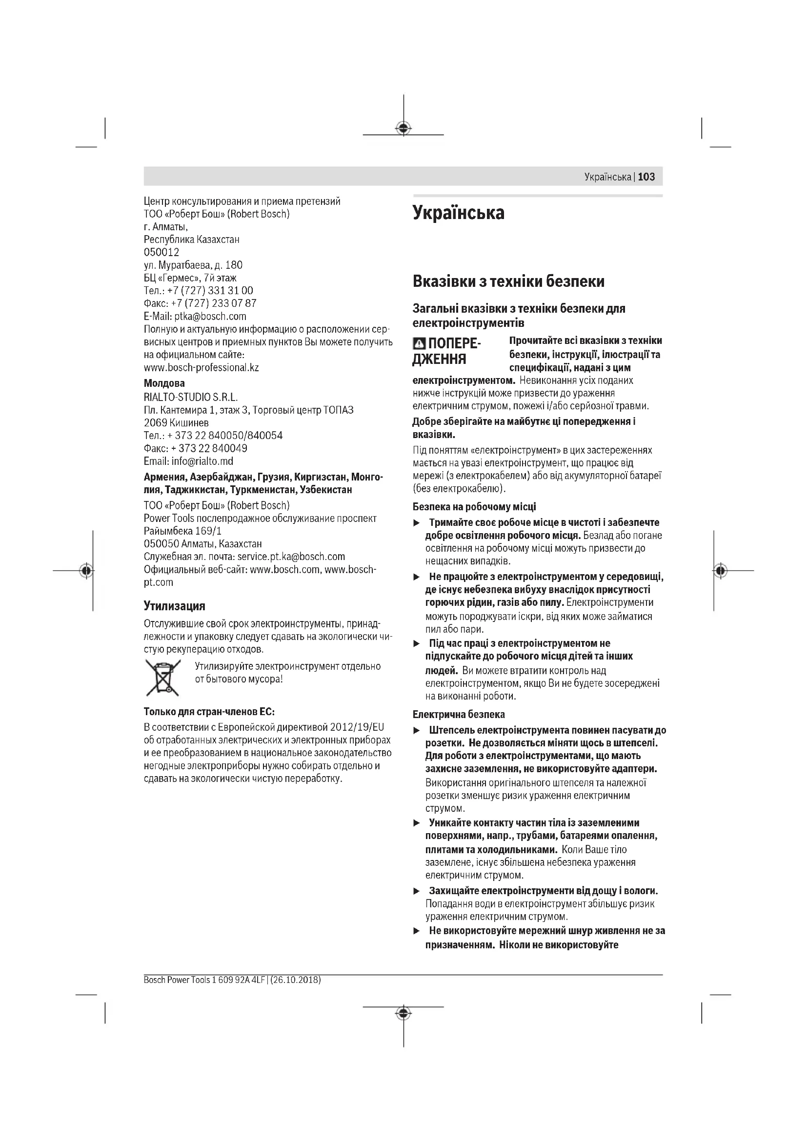Бош Сервісний Центр електроінструментів вул. Крайня 1 02660 Київ 60 Тел.: +380 44 490 2407 Факс: +380 44 512 0591 E-Mail: pt-service@ua.bosch.com www.bosch-professional.com/ua/ukАдреса Регіональних гарантійних сервісних майстерень за- значена в Національному гарантійному талоні.