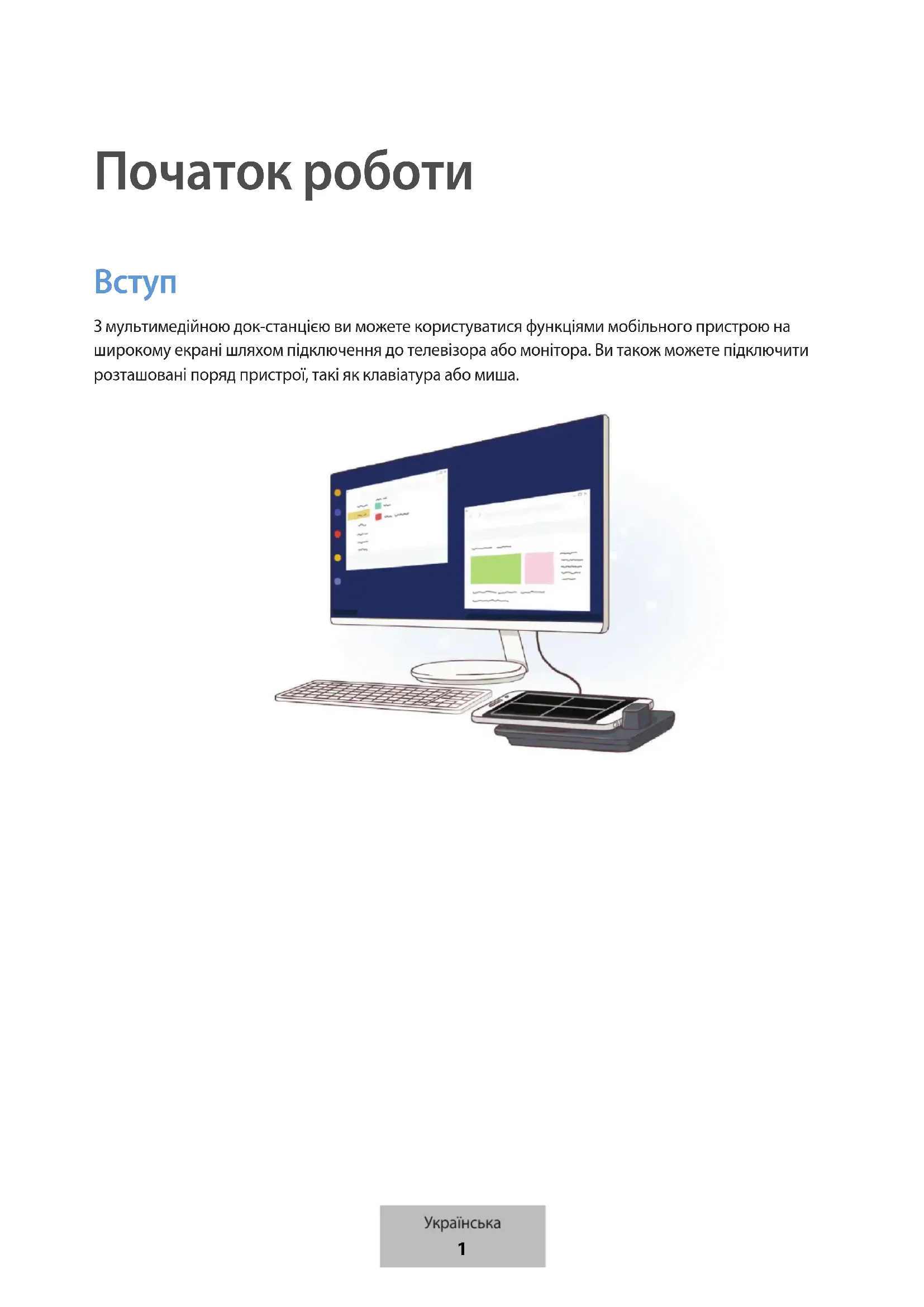 Мультимедійну док-станцію можна використовувати лише з підтримуваними мобільними пристроями з операційною системою Android версії 8.0 або вище. Переглянути сумісні пристрої можна у вступній частині до мультимедійної док-станції на веб-сайті Samsung. Пояснювальні значки Попередження: ситуації, що можуть призвести до травмування себе або інших осіб Увага: ситуації, що можуть призвести до пошкодження пристрою або іншого обладнання Примітка: примітки, поради з користування або додаткова інформація