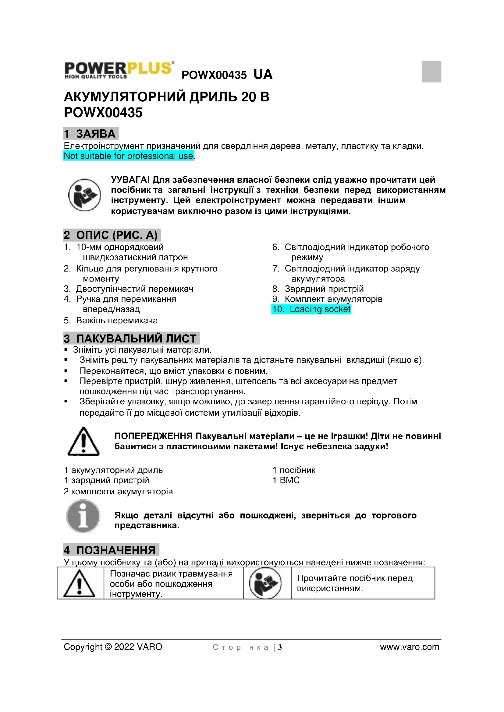 Прочитайте посібник перед використанням.POWX00435 UA Copyright © 2022 VARO С т о р і н к а | 4 www.varo.com