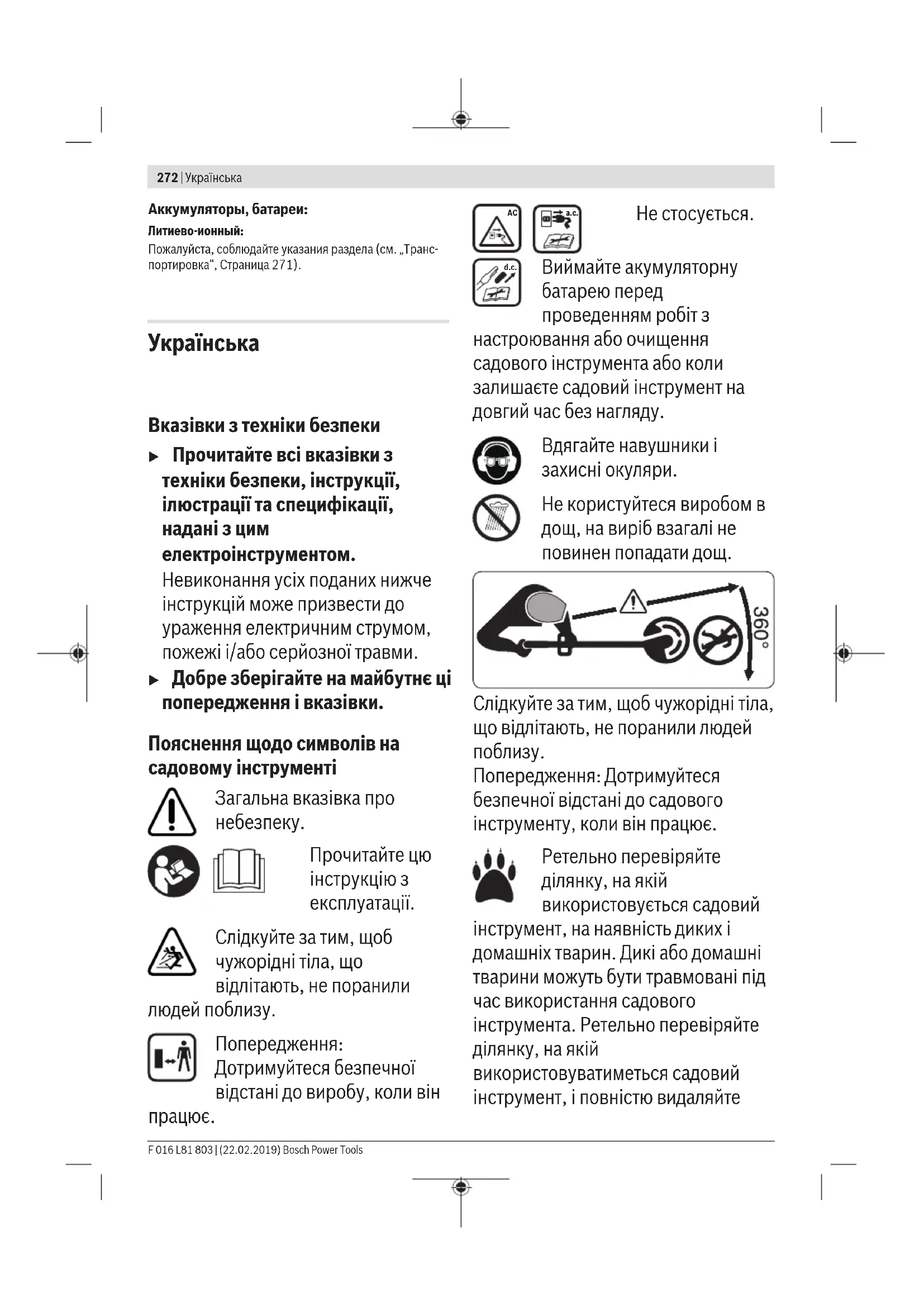 Попередження: Дотримуйтеся безпечної відстані до садового інструменту, коли він працює. Ретельно перевіряйте ділянку, на якій використовується садовий інструмент, на наявність диких і домашніх тварин. Дикі або домашні тварини можуть бути травмовані під час використання садового інструмента. Ретельно перевіряйте ділянку, на якій використовуватиметься садовий інструмент, і повністю видаляйте F 016 L81 803 | (22.02.2019) Bosch Power ToolsУкраїнська | 273 каміння, палки, дроти, кістки й інші сторонні предмети. Під час використання садового інструмента слідкуйте за тим, щоб у густій траві не було прихованих диких або домашніх тварин чи невеликих пнів