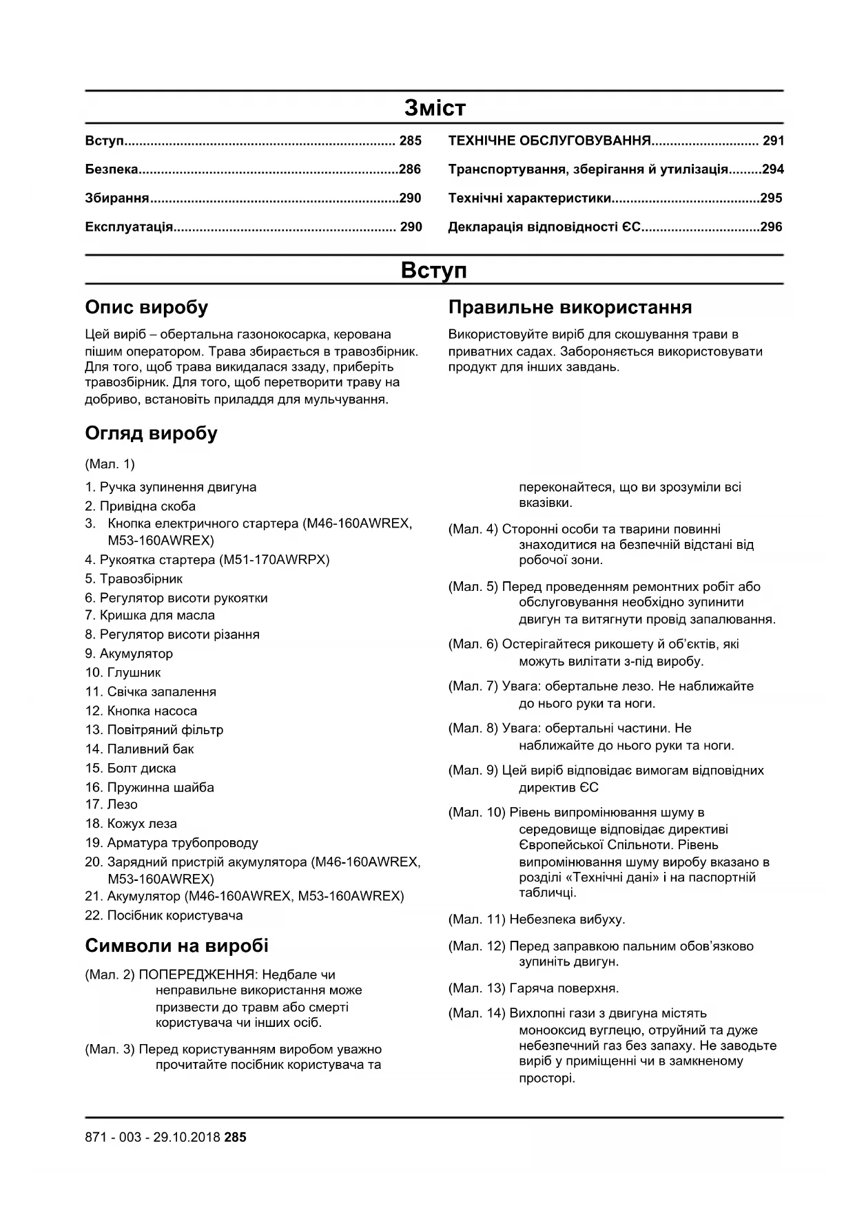 (Мал. 4) Сторонні особи та тварини повинні знаходитися на безпечній відстані від робочої зони. (Мал. 5) Перед проведенням ремонтних робіт або обслуговування необхідно зупинити двигун та витягнути провід запалювання. (Мал. 6) Остерігайтеся рикошету й об’єктів, які можуть вилітати з-під виробу. (Мал. 7) Увага: обертальне лезо. Не наближайте до нього руки та ноги. (Мал. 8) Увага: обертальні частини. Не наближайте до нього руки та ноги. (Мал. 9) Цей виріб відповідає вимогам відповідних директив ЄС (Мал. 10) Рівень випромінювання шуму в середовище відповідає директиві Європейської Спільноти. Рівень випромінювання шуму виробу вказано в розділі «Технічні дані» і на паспортній
