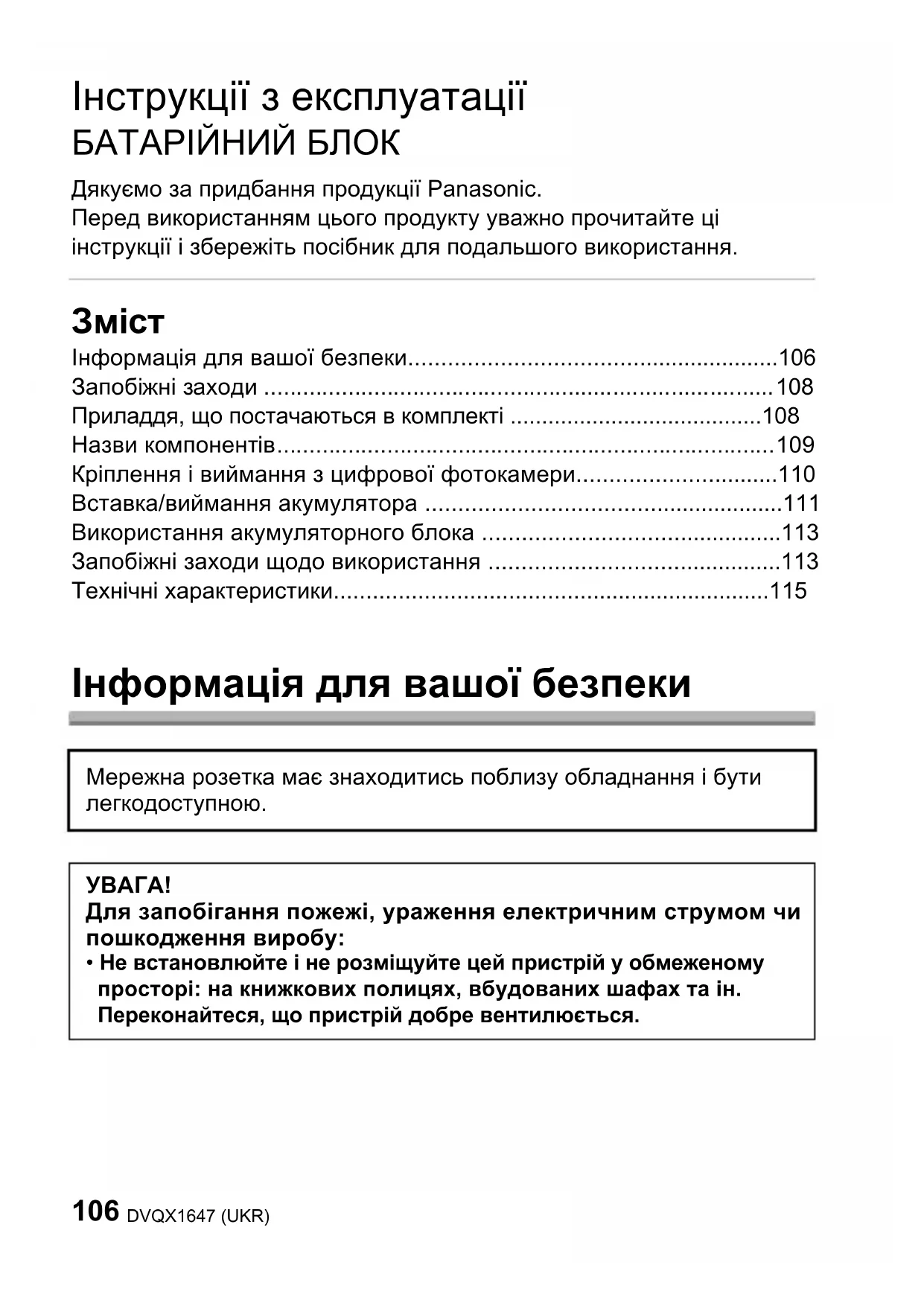 - Не встановлюйте і не розміщуйте цей пристрій у обмеженому просторі: на книжкових полицях, вбудованих шафах та ін. Переконайтеся, що пристрій добре вентилюється. DVQX1647.book 106 ページ 2019年1月9日 水曜日 午後5時46分107 (UKR) DVQX1647 ∫ Про батарейний блок